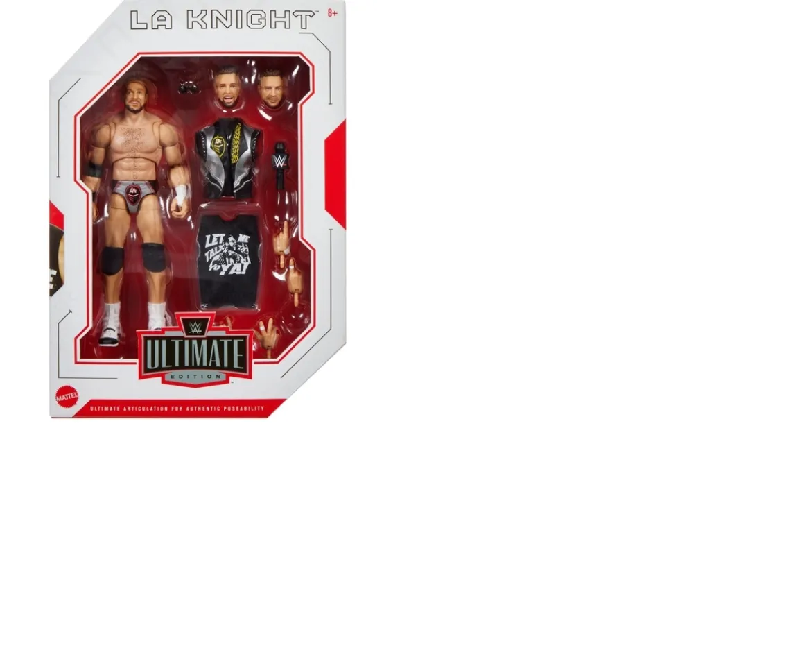 Recreate signature moves and ring entrances with the WWE Ultimate Edition Series 23 LA Knight Action Figure. Each 15cm figure features deluxe articulation with 30 movable points, TrueFX detailing, swappable hands, multiple heads and iconic ring gear for collectors to display or kids to play!Pose him in a menacing stance, pair with another figure to battle or create total mayhem by adding multiple figures. WWE fans can collect them all to make their collections the best! Each sold separately, subject to availability. Colours and decorations may vary.