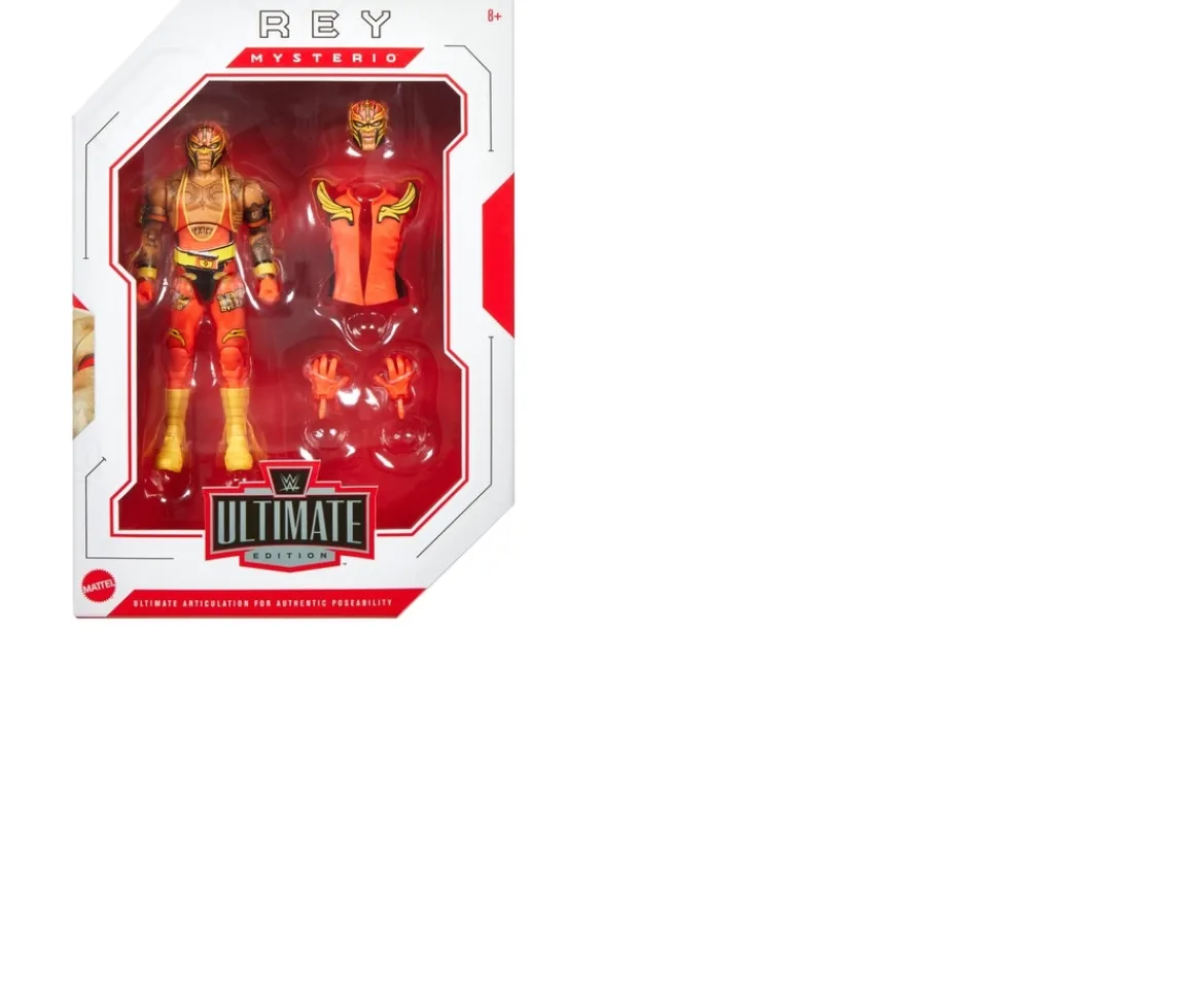 Recreate signature moves and ring entrances with the WWE Ultimate Edition Series 23 Rey Mysterio Action Figure. Each 15cm figure features deluxe articulation with 30 movable points, TrueFX detailing, swappable hands, multiple heads and iconic ring gear for collectors to display or kids to play!Pose him in a menacing stance, pair with another figure to battle or create total mayhem by adding multiple figures. WWE fans can collect them all to make their collections the best! Each sold separately, subject to availability. Colours and decorations may vary.