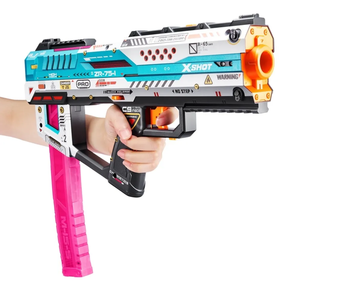Take your dart blasting to the next level with the XSHOT Skins Pro Series Fury-X Blaster. The Fury-X is designed to achieve accuracy and distance in every blast. Equipped with a quick release 20 half dart capacity clip, your blaster battles have just gone pro!Includes 40 XSHOT Air Pocket Technology half darts for a further, faster and more stable flight. Featuring Slam Fire Action to blast through the 20 dart clip in seconds and take out targets up to 20 metres away! Go next level with XSHOT Pro Series.