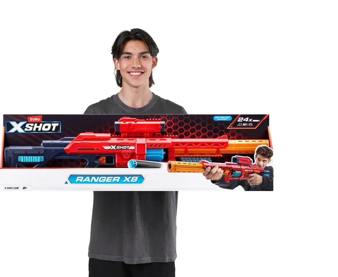 The XSHOT Excel Ranger X8 packs enough power to take on targets 27 metres away! This beastly blaster blows away the competition with a rapid-fire of 8 darts in seconds using the rotating barrel. Intimidate your opponents with this imposing blaster and blow away the competition!Fire with accuracy with the detachable scope and use the bolt action priming mechanism to strike the competition before they see you coming. The Ranger X8 includes 24 Air Pocket Technology darts for a further, faster and more accurate blast!