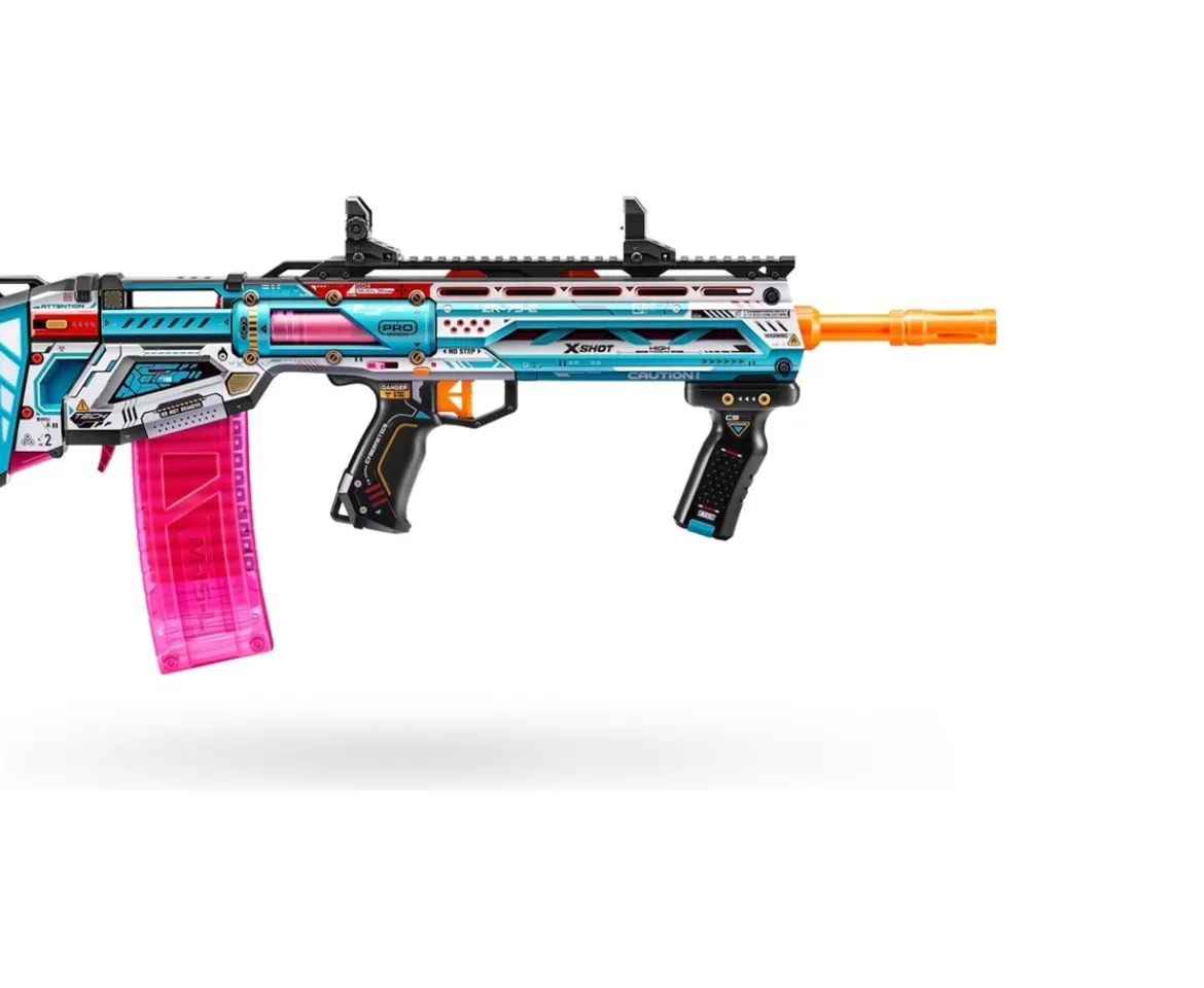 Add style to your armoury with the XSHOT SKINS Pro Performance Long Shot Blaster! The Blaster is designed to achieve accuracy and distance in every blast.Equipped with 2 quick release dart clips, it is compatible with both full and half-length darts, both including XSHOT Air Pocket Technology for a further, faster and more stable flight. Use Slam Fire Action to blast through the 20 dart clip in seconds and take out targets up to 20m / 66 feet away!