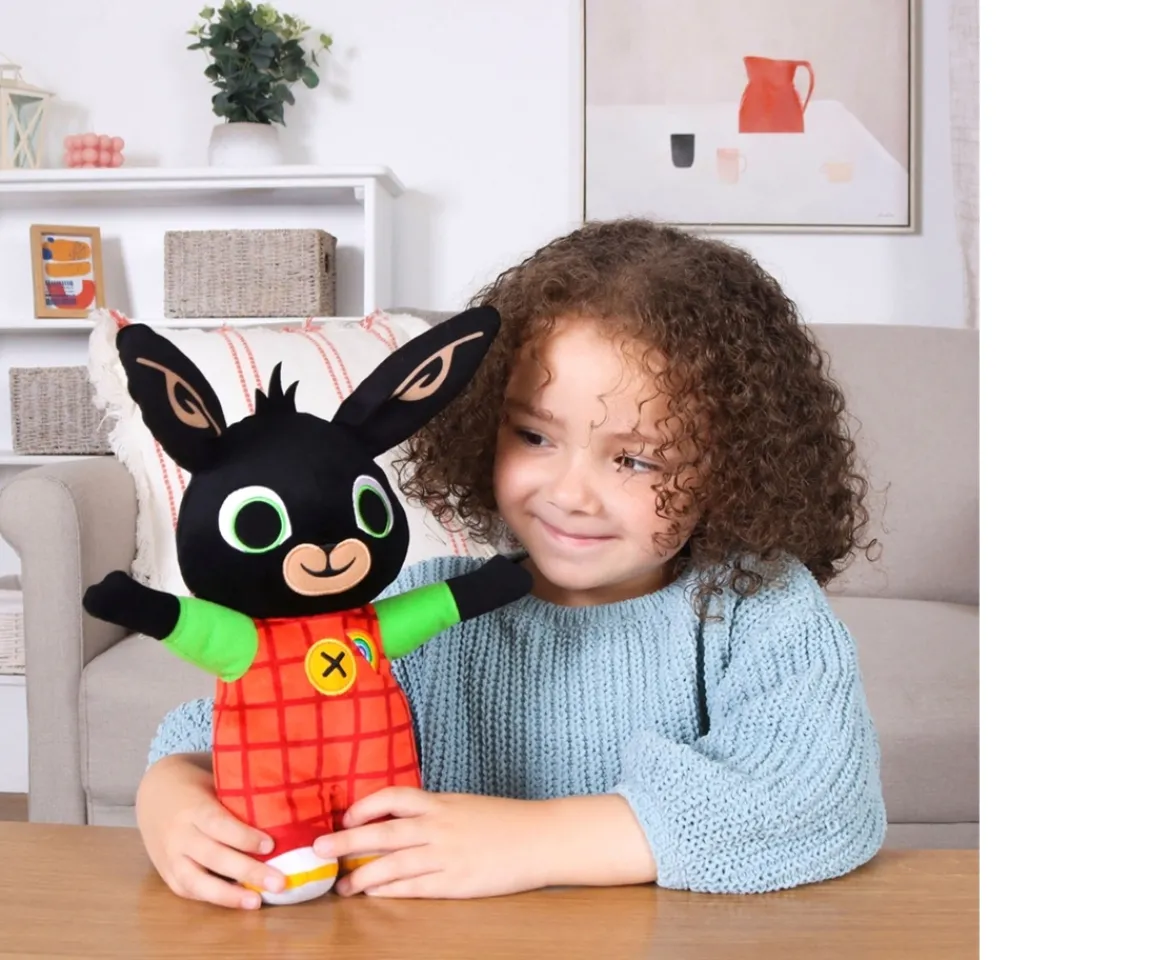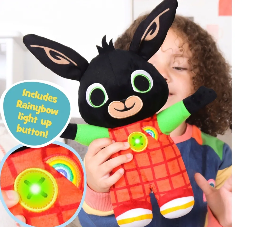 Introducing the charming Talking Rainybow Bing soft toy, your favourite cuddly companion that plays music and lights up! With 12 charming phrases including Bing humming, the Rainybow tune and instrumental music to entertain and delight!Made from soft material, 30cm tall Bing is the perfect companion for cuddles and a sing song! Bings trademark button also lights up!