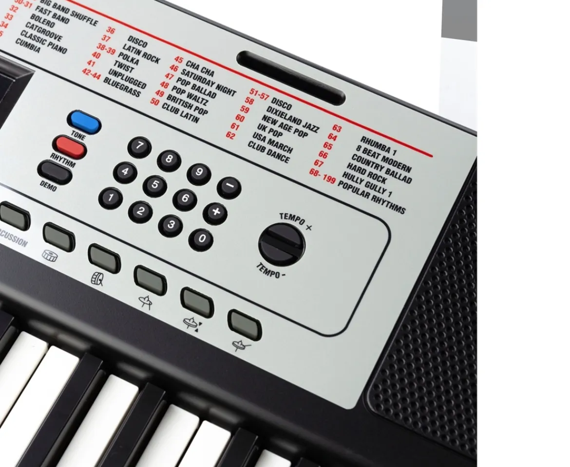 This 54-key keyboard is packed full of modern features that will enable you to express your creativity without limitations,taking you from an aspiring musician to a capable pianist.Beginner’s Piano Keyboard: This electronic keyboard is home to 200 tones, 200 rhythms, 50 demo songs, split mode, and vibrato. Budding musicians can also use the transpose, record, and playback functions. These options help improve your skills as a pianist.Play Anywhere Powered by both mains power (adapter included) or batteries (not included) and with a highly portable body, this musical keyboard can be used both on the move and in the home environment.Sheet music stand included to support both sheet music and smart devices (not included) – so you can read music as you play.