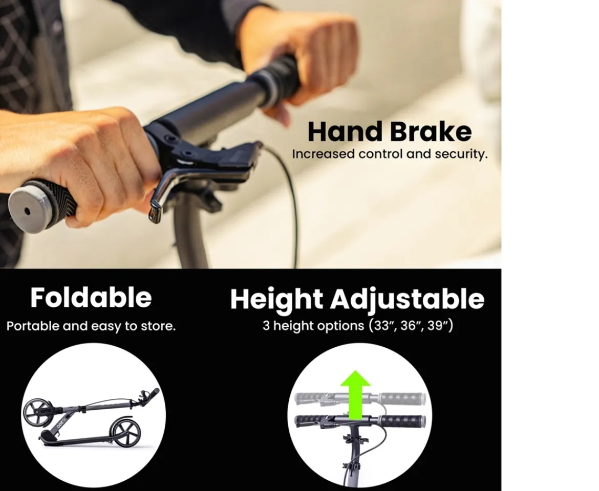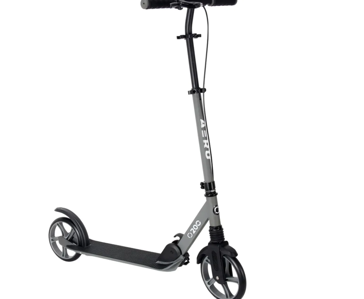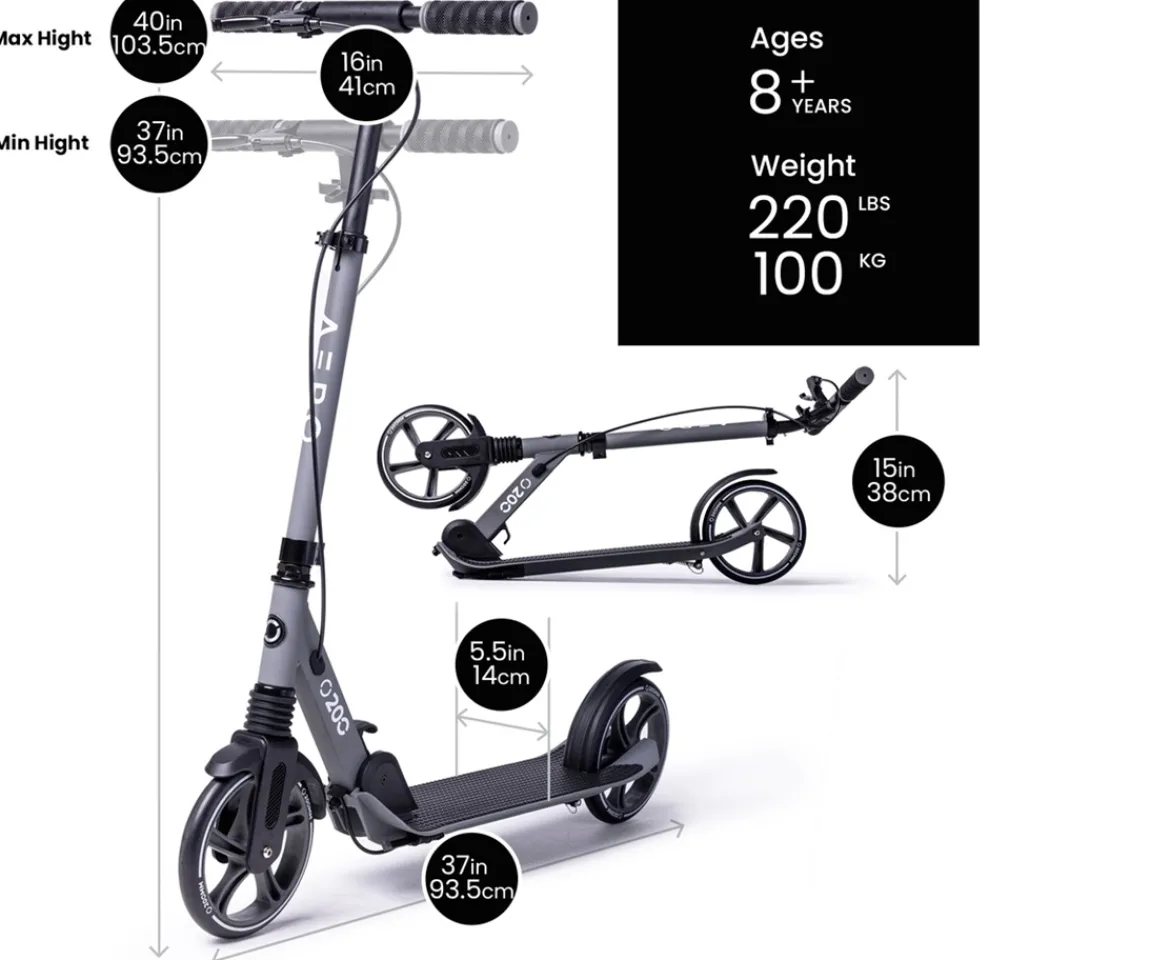 Aero A200 adult kick scooter with 200mm large wheel, front suspension, and handbrake, aluminum frame, super wide deck and TPR soft mat foldable and 3 heights adjustable.This foldable scooter is ideal for adventures on the go. With a strong steel frame and superior suspension, the Aero A200 takes you further! The handlebar height can be adjusted to suit your child, with a super wide desk and 200mm large wheels.