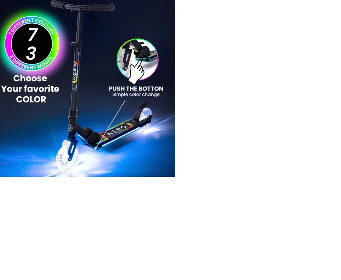Take to the great outdoors with the Aero C3 scooter. These two-wheel kick scooters feature dynamic RGB lights, to light up your route!Built for DurabilityThe Aero C3 scooter is foldable and height-adjustable, so it’s easy to take along, and grows with you! These scooters come with 145mm clear wheels – perfect for displaying the different lights and light modes. The bright deck lights reflect on the clear wheels, adding an extra- fun layer to your scooting.