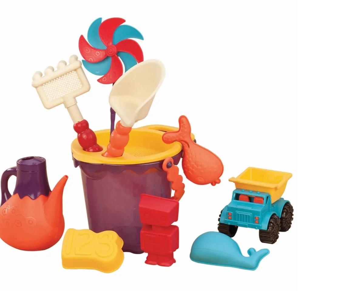This Summer Beach Bag is a must have when taking your little ones to the beach. Included in this beach bag, is a bucket , a rake and shovel with groovy grips, 4 funky sand moulds, mini monster truck, a watering can for your classic beach fun, sand sifter and spinning pinwheel