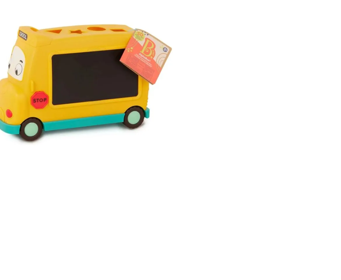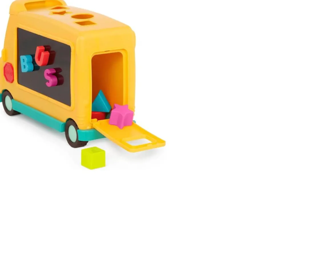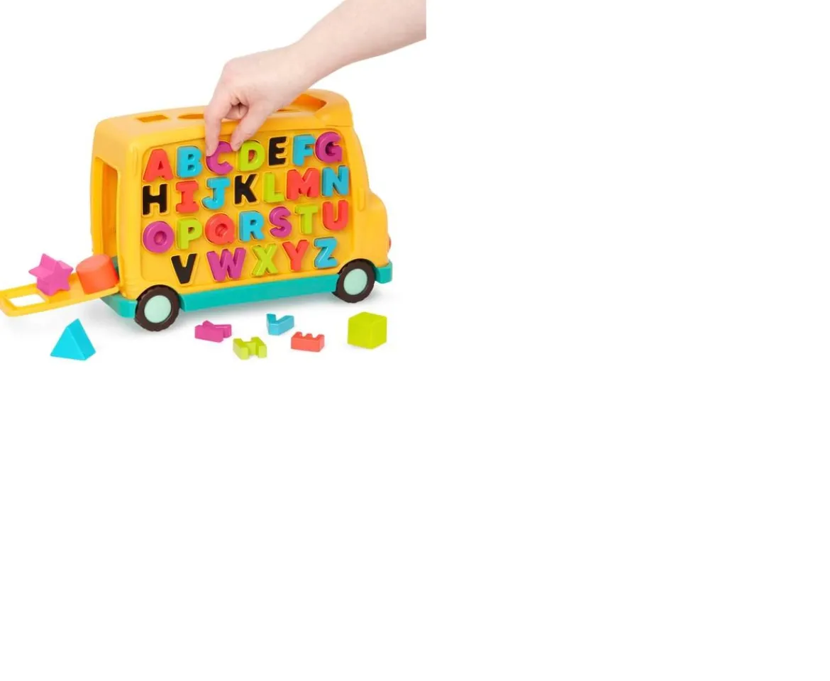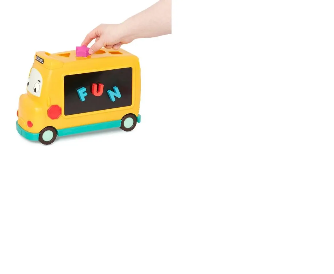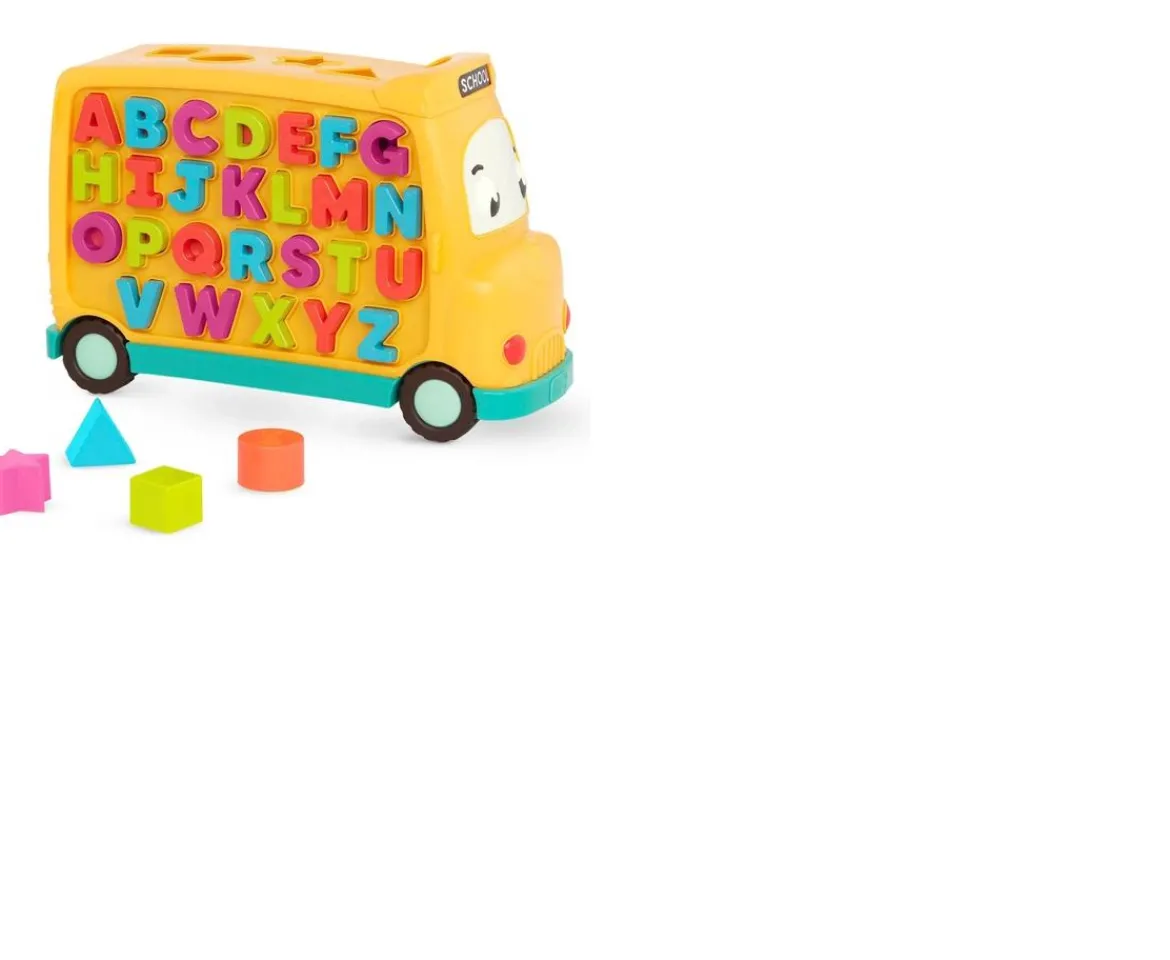 Ride, sort, learn and play the days away with the AlphaBus from B. Toys! This toy school bus comes with 26 easy-to-hold letter pieces and 4 colorful shapes.Kids can build different words on the magnetic board, then flip the bus to play a shape sorting game on the other side.The school bus has a slot for each letter and 4 slots on the roof for every shape! Match each letter and shape to its place, watch them fall inside the bus, then open the back door to retrieve ‘em and go again!Playing with the AlphaBus not only comes with tons of fun, but it can help children learn letters, develop their vocabulary and improve their fine motor skills.