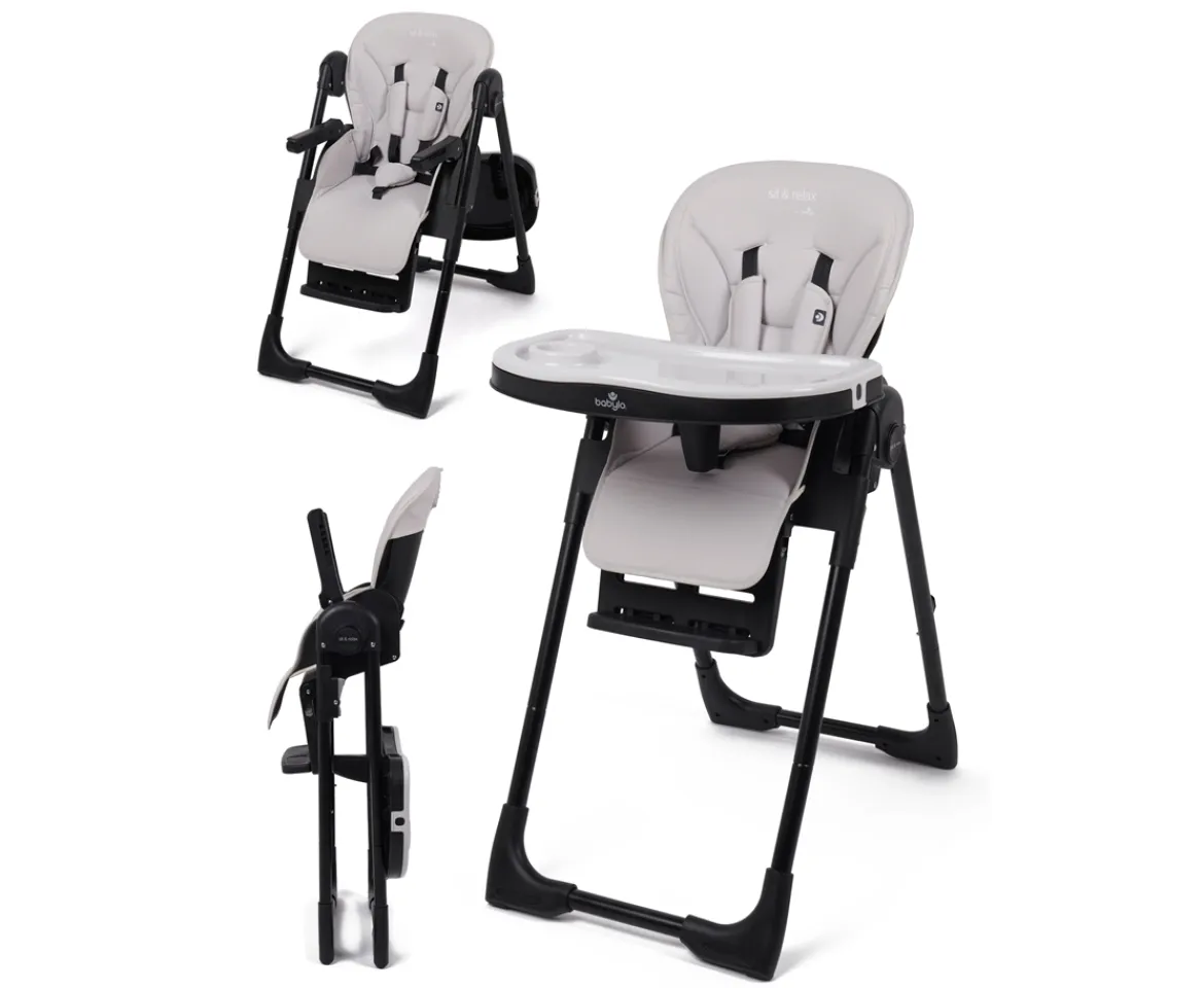 Introducing the Babylo Sit & Relax Highchair: The Ultimate Support for Your Growing ChildFrom newborns to toddlers, this highchair offers full support for your little one. The contemporary design, with a leatherette seat, plush liner, and modern black frame, combines comfort and style. The fully reclining chair is ideal for newborns for added comfort.As your child grows, the Babylo Sit & Relax Highchair adapts with them. It offers three reclining positions and six height adjustments, so your child can sit at the table with the rest of the family. The soft safety harness keeps your baby secure, and the three adjustable footrest positions ensure correct posture for the duration of the chair’s lifespan.The highchair’s tray has three positions and is detachable for easy use. It can be conveniently stored on the back legs of the chair. It very easy to fold & compact to store.