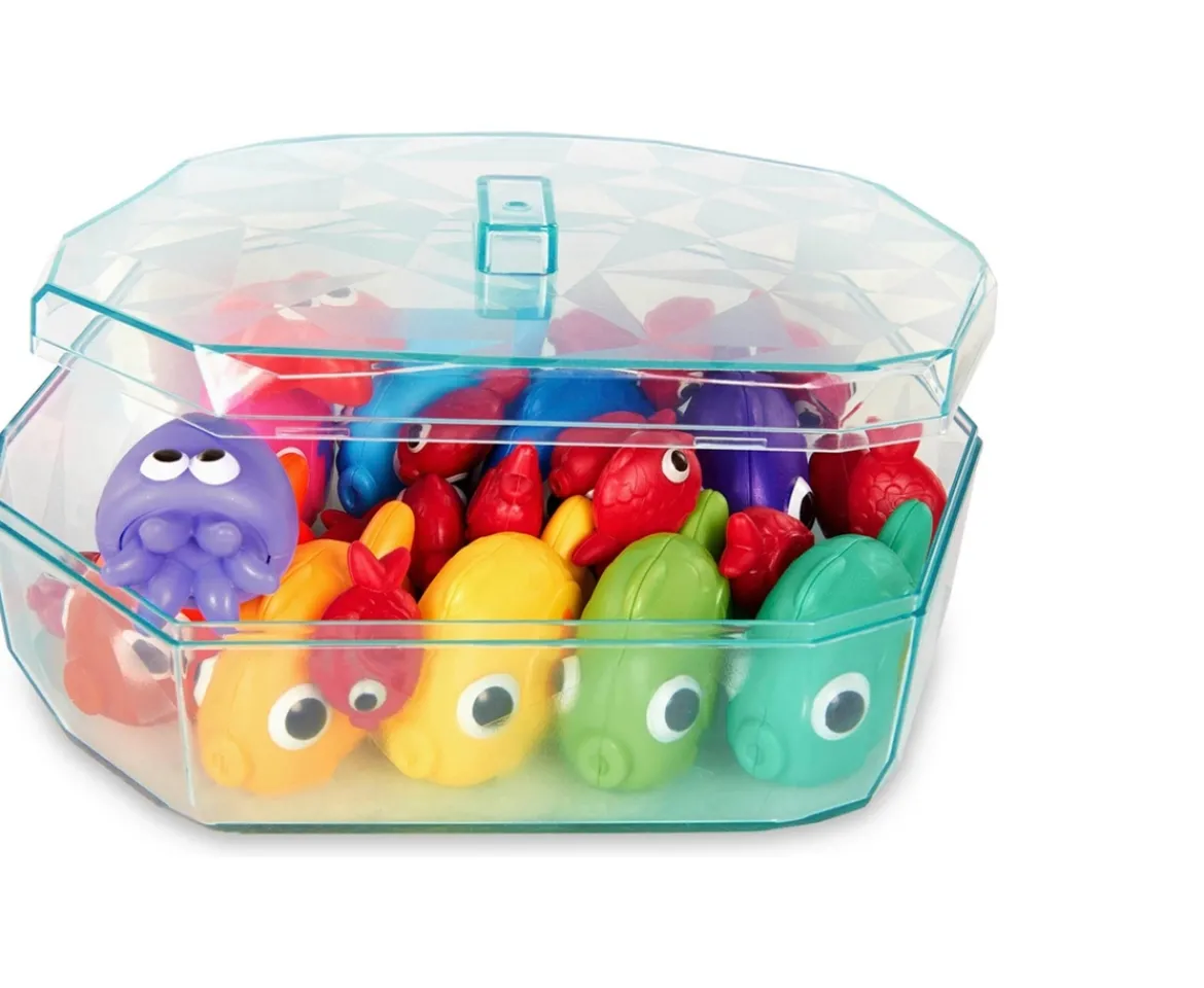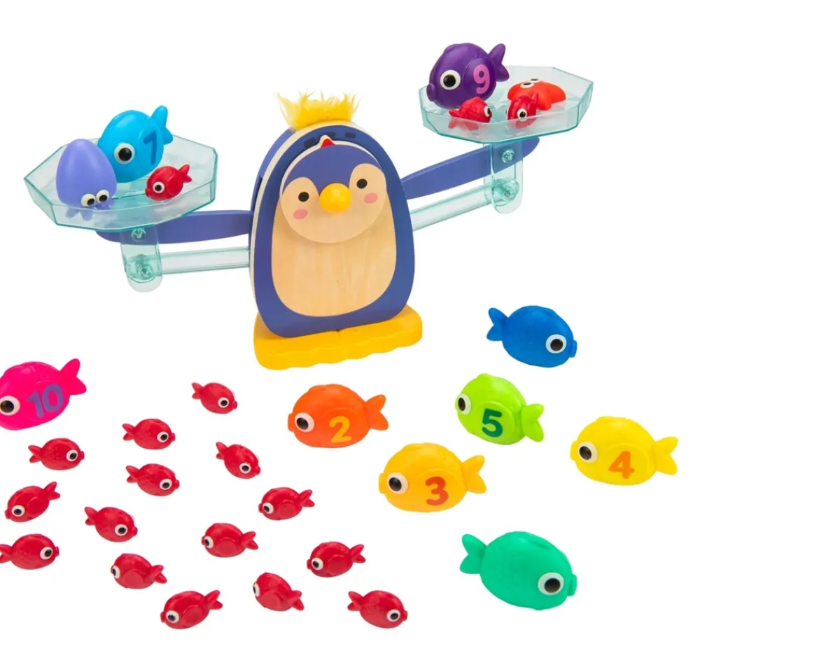 - Contents: 1x Penguin Scale with 2 Balancing Trays; 1x Storage Container; 19x Small Fish; 9x Big Fish; 1x Squid; 1x Starfish; 3x Playbooks; 1x Play Guide