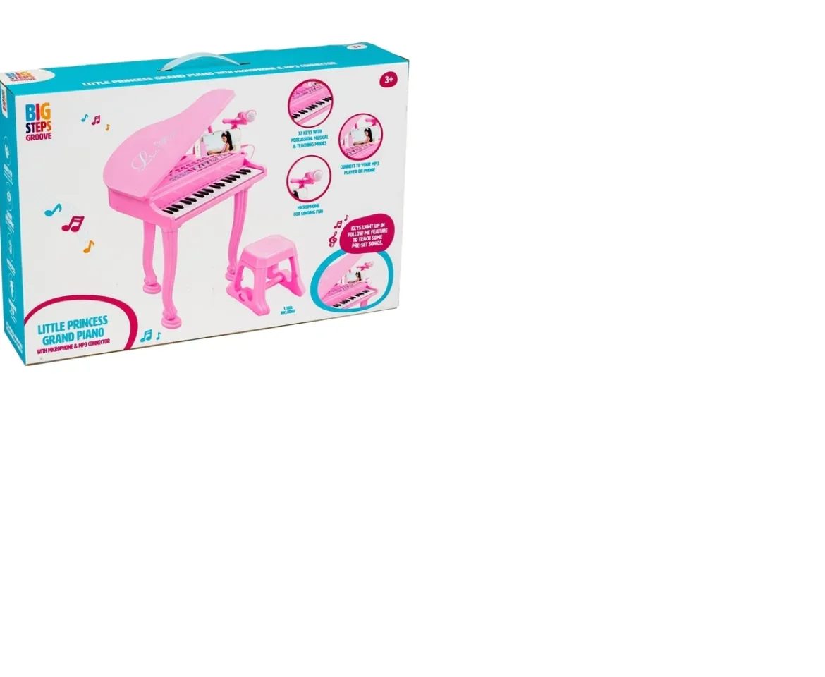 Take a big step into music with the Big Steps Groove Little Princess Grand Piano. This preschool instrument features 37 black and white keys across 3 octaves. Little musicians can explore 8 different styles of music and 8 instrument tones.High quality sound, a built-in microphone and an LED teaching mode encourage kids to follow tunes and help teach musical notes. The Big Steps Groove Little Princess Grand Piano has an elegant design and comes with a matching piano stool.The Big Steps Groove Little Princess Grand Piano is perfect for creative play. Exploring sound and rhythm helps children to develop memory, pattern-seeing and problem-solving skills. When children learn rhythm, they learn coordination, fine motor skills and math