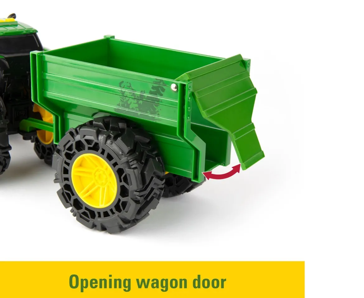 Monster Treads combine the realism of John Deere with awesome monster vehicle styling for the best of both worlds! This John Deere toy tractor with wagon features lights, sounds, and trademark super bouncy tires for extra action and off-road adventures! Additional features include re-designed tire treads and an opening wagon door. The perfect gift for that younger John Deere fan in your life! Batteries included so the fun can start right away.