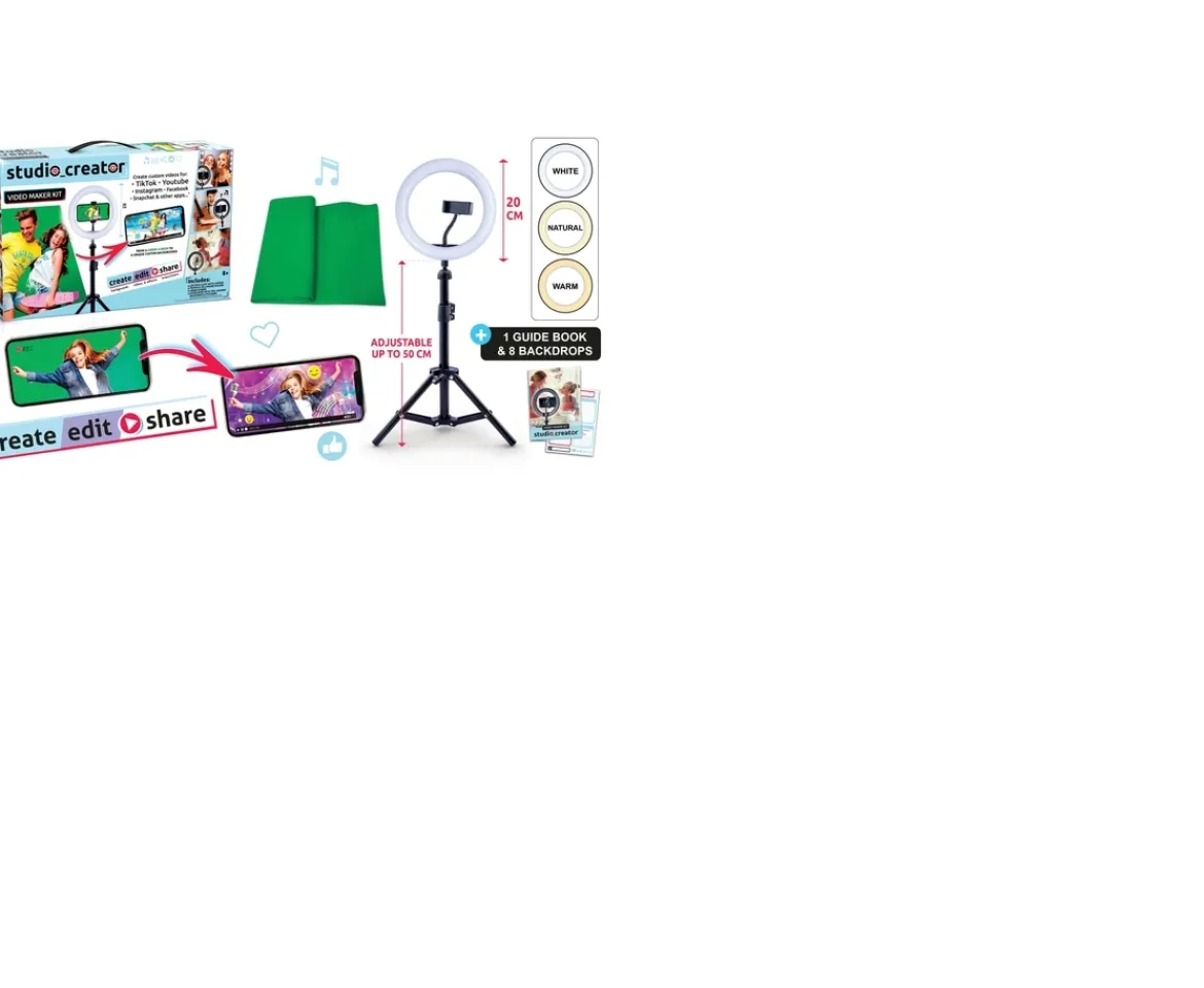 A complete studio set perfect for to create and record your own videos to unleash on the world! The set includes an adjustable tripod, LED ring light with three different light moods and 180 degree rotation, green screen and a handy guide book that contains hints and tips on creating the perfect video! The guide also contains useful information on keeping safe online!