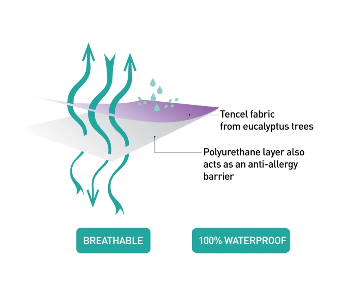 Tencel Waterproof Mattress Protector fitted sheet has been designed to help you and your toddler through the stresses of nighttime toilet training. Made with 100% Tencel, with fibers derived from sustainable wood sources, it is naturally anti-microbial, resisting dust mites, bacteria & allergens. It is luxuriously soft, breathable, waterproof and absorbs substantially more than cotton ensuring a drier and healthier sleeping climate. With a polyurethane waterproof under layer and 360° elastic for secure fitting it is an easy, practical and discreet way of guarding against wet beds and damaged mattresses. Ideal for sensitive skin.