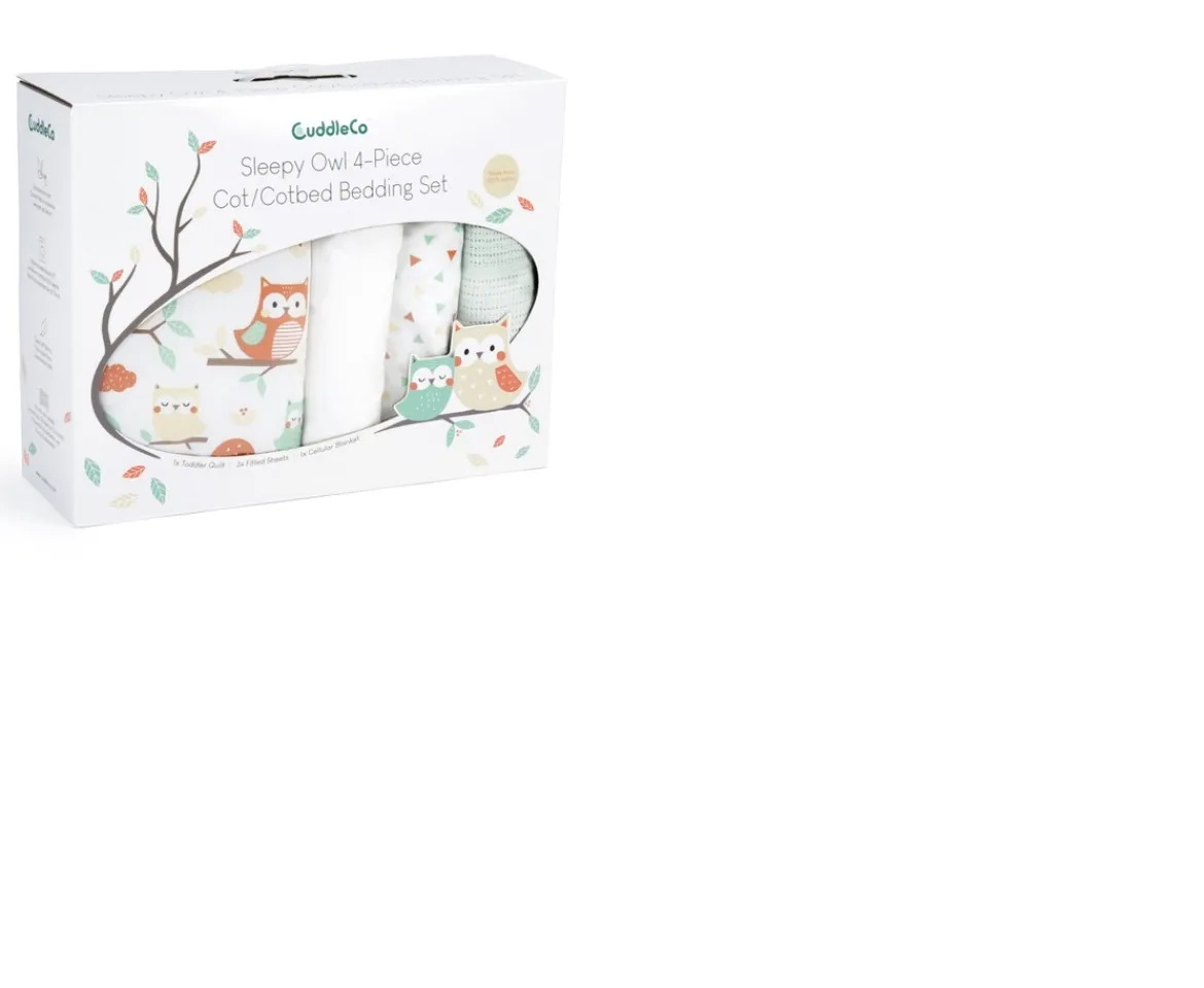The CuddleCo Sleepy Owl 4-Piece Bedding Set is a sleep time essential for your little one. This super-soft bedding bundle is ideal from newborn to toddler, made from 100% cotton material for your baby’s delicate skin, and breathable for a comfortable night’s sleep. The Spring Skies 4-Piece Set features warm tones with an adorable owl design you’re sure to love.This baby bedding bundle contains everything you need for a snug bedtime. It includes a cosy toddler quilt cover with light wadding featuring a reversible design for two styles in one! It also contains two cotton fitted sheets to help keep your little one cool while they sleep, with elasticated edges for a secure fit, as well as an open knit, breathable cellular blanket suitable from birth. Easy to wash, you can simply pop it into the washing machine at 30 degrees.
