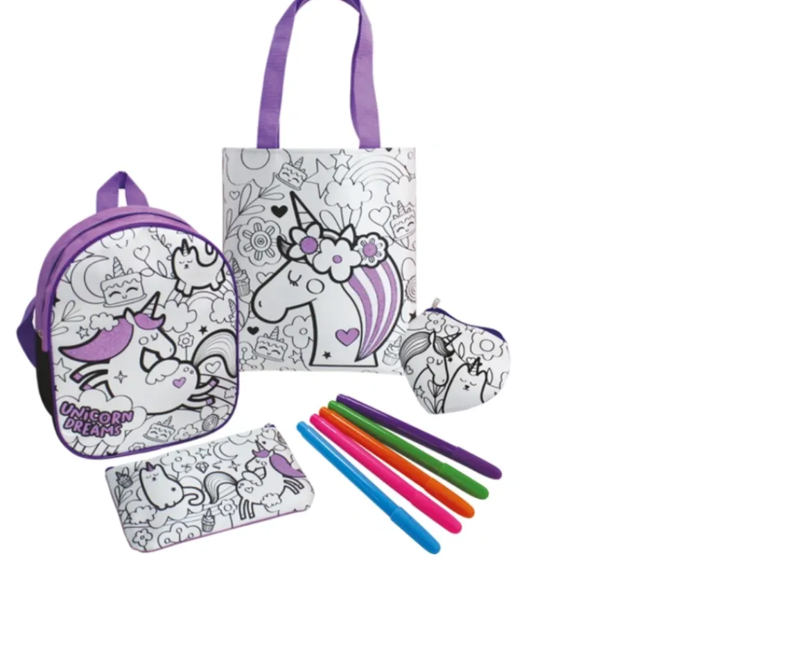 Set of 4 colour your own bags. Use the permanent markers provided to add pops of colour to this collection of kids bags. Follow the printed design of unicorns and cool rainbows selecting your favourite colour as you draw and fill in the shapes.There is extra sparkly glitter added to make your works of art look sparkly when you are wearing them or taking them to school or to sleepovers.