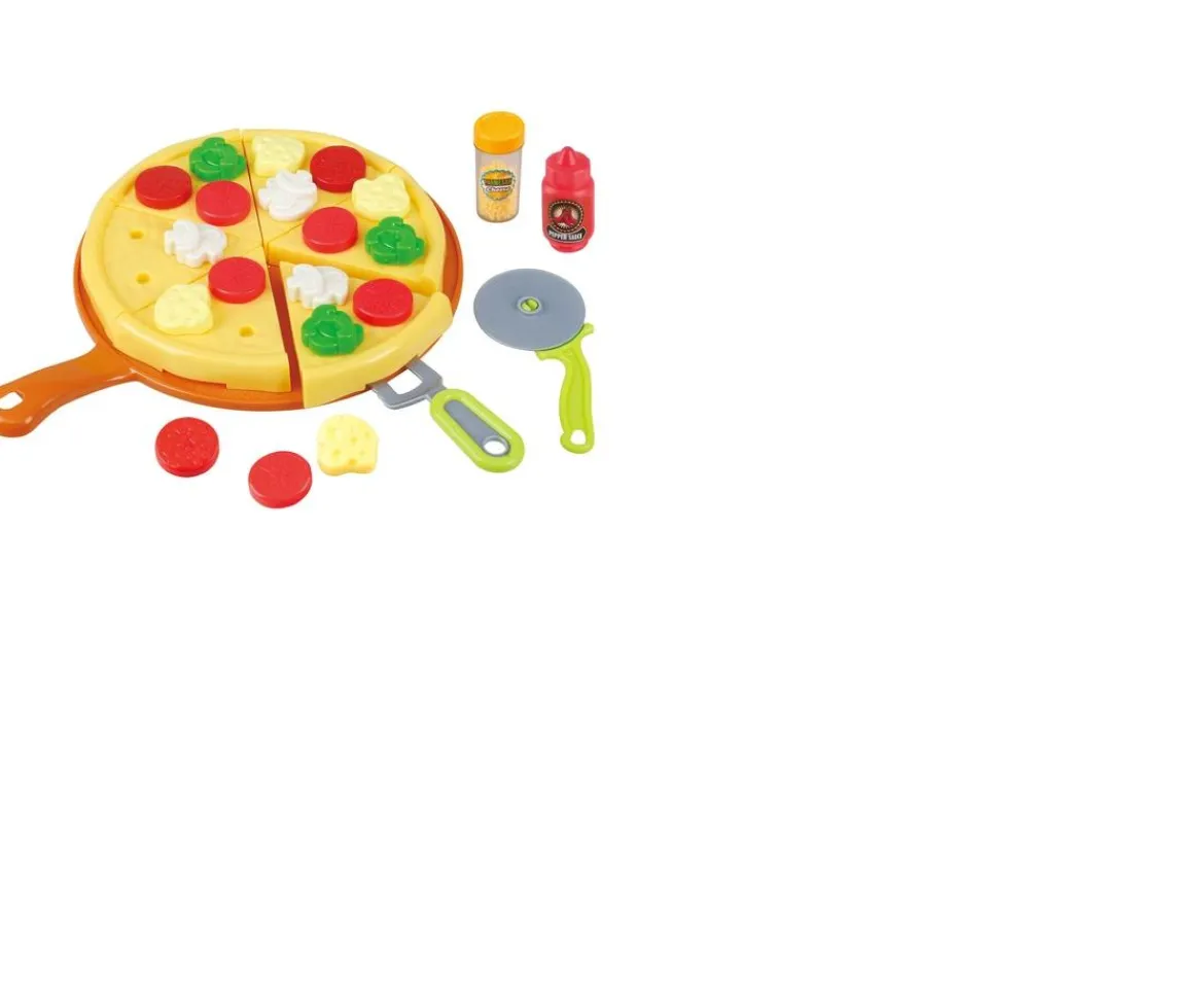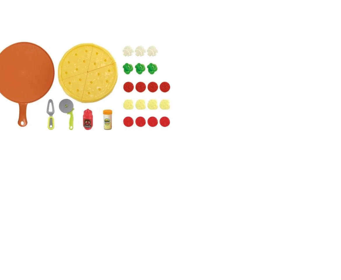 - Contents: 1x tray, 6x pizza pieces, 1x cheese shaker, 1x sauce bottle, 2x pizza utensils, 18x topping pieces