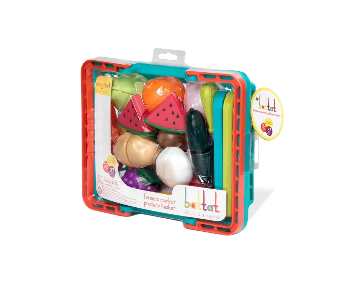 - 37-piece Food Playset: This toy food basket is filled with everything a little chef needs to prepare an imaginary homemade feast!</li>Includes: This playset comes with 1 basket, 2 cutting board, 2 toy knives, and 16 different fruits and vegetables with hook-and-loop fasteners (2 pieces each).</li>Chop it Up: The play foods’ fasteners come apart easily when your toddler “slices” through them!</li>Developmental Toy: Role-playing with this kit improves your child’s social and language skills.</li>Recommended Age: Toddlers 2 years +</li>