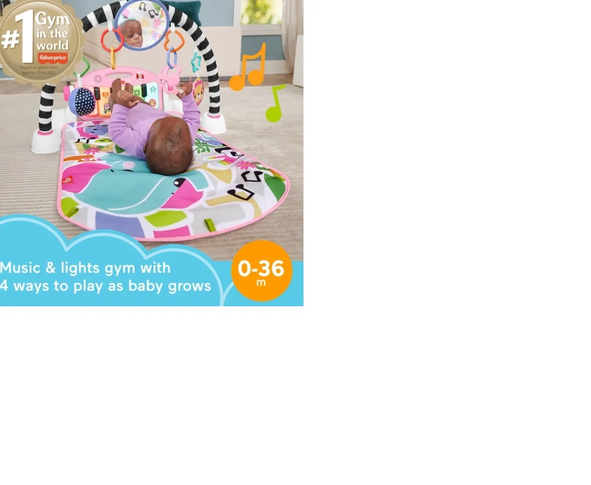 Baby will love exploring all the sights and sounds of this interactive baby activity centre. With music and sounds, there’s so much to explore!Engage All Their SensesFisher-Price Deluxe Kick & Play Piano Play Mat can help strengthen motor skills as a baby stretches and kicks. The Piano Play Mat helps enhance hand-eye coordination as baby bats and plays the piano keys. Dancing lights and a mirror stimulate visual senses. As your baby grows the Smart Stages technology lets you change the learning content to suit your baby’s age.Different Ways to PlayThere are four ways to play with this Fisher-Price Deluxe Kick & Play Piano Baby Play Mat. Babies can lay and play, enjoy tummy time, sit and play and use the removable piano for take-along fun.Hanging ToysThis baby activity centre features hanging toys, to encourage hand-eye coordination. Plus, the arch moves down for tummy time. With different colours and textures to explore, there’s so much to discover! These baby toys are also detachable, for take-along fun. This helps keep baby occupied in the car, carrier, or strolle
