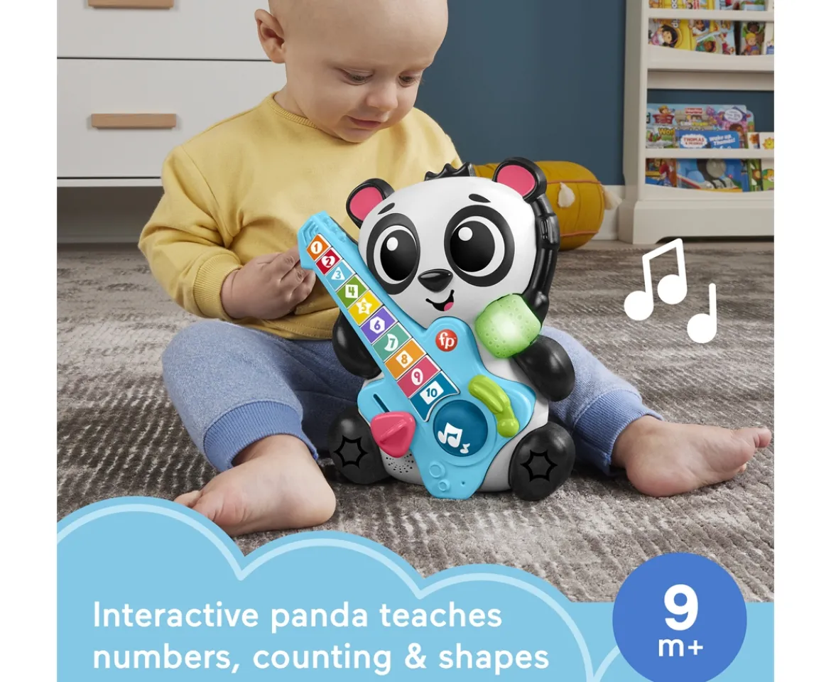 Babies and toddlers can count on fun with the Link Squad Jam & Count Panda musical toy from Fisher-Price. When kids press the 10 colourful guitar buttons or spin the roller ball, Panda’s microphone lights up to sync to the beat with songs, sounds and phrases about counting and more.Kids can use the awesome whammy bar to play guitar sound effects and use the pick clicker for added sensory play. Plus, when Panda meets up with other members of the Link Squad band, they light up to sing and play together for more learning fun! (Each sold separately)