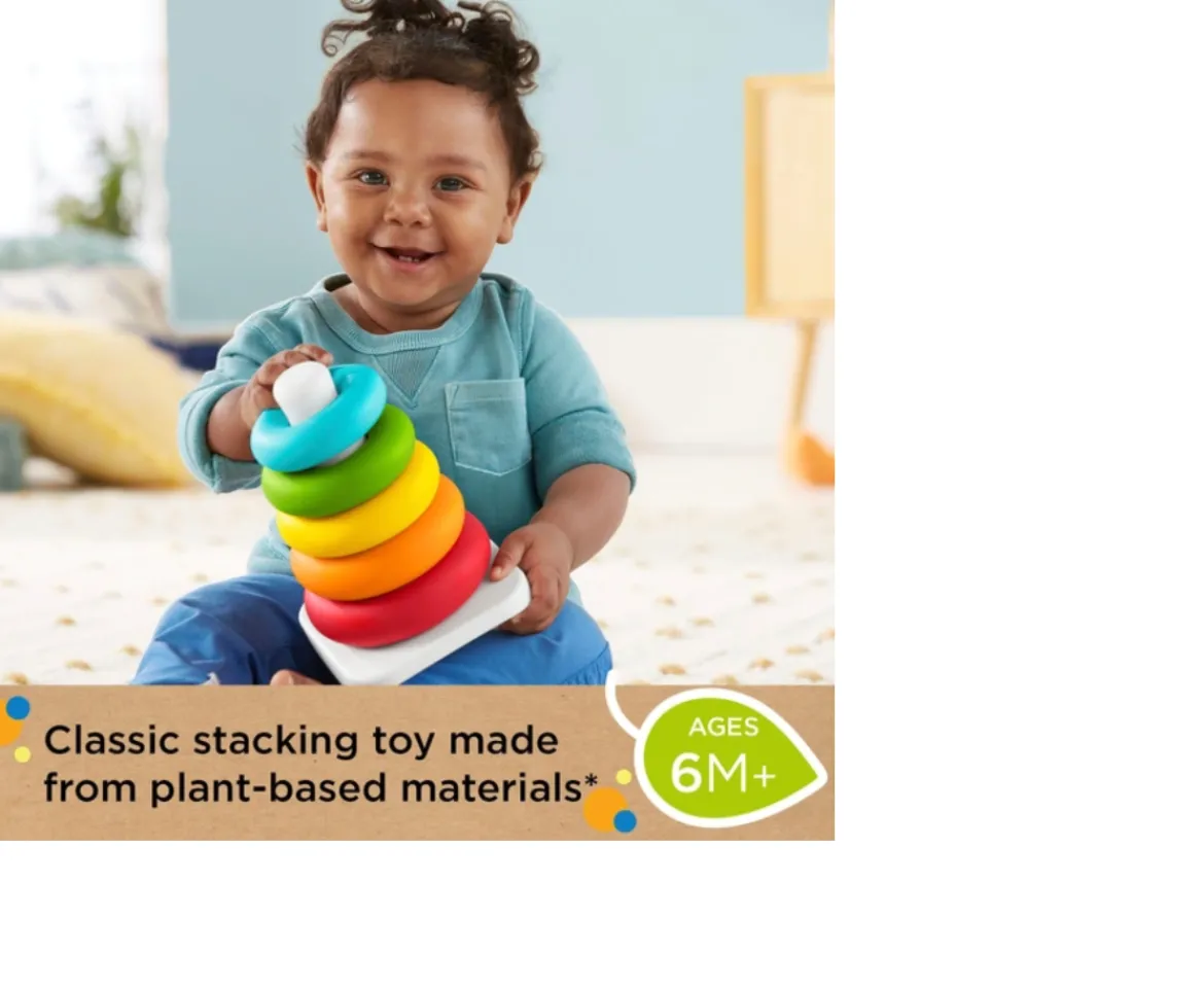 Made with plant-based materials, the Fisher-Price Rock-a-Stack toy is a classic stacking toy for little ones. The wibbly-wobbly rocker base is made for bat-at fun, with 5 colourful rings for little hands to grasp and stack.A Fun Learning ToolStacking the rings helps baby develop their hand-eye coordination. The Fisher-Price Rock-a-Stack baby sensory toy introduces the concept of relative size as baby learns to sort and stack the rings from biggest to smallest.Plant-Based ToyThe Fisher-Price Rock-a-Stack baby sensory toy is made from a minimum of 90% ethanol extracted from sugar cane. It even comes in FSC certified packaging for greener play.Sensory PlayBaby sensory toys are hugely beneficial to your child’s development. This baby sensory toy has bright colours and hands on activities to stimulate your baby’s senses.