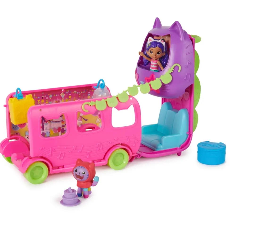 - TRANSFORMING PARTY BUS: Gabby’s party bus is a mobile fun factory. Pop open the side door and raise the cab upwards into DJ booth mode, revealing a dance floor, a spinning karaoke stage and party sofa