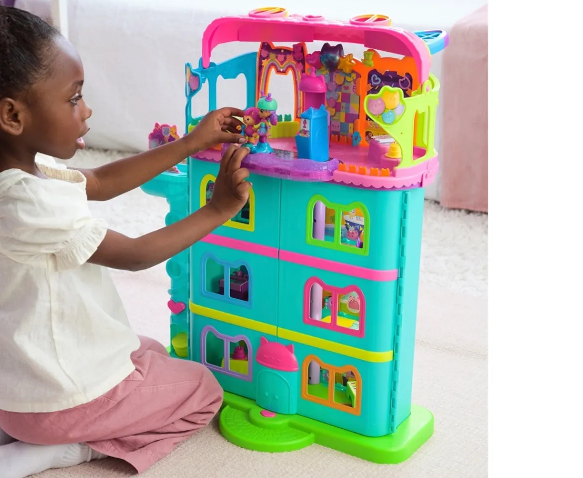 Step into the magical world of Gabby’s Dollhouse with Gabby’s Party Room Playset. This set includes exclusive 10cm Skater Gabby and Skater Marty the Party Cat toy figures with working skates, along with a skate ramp, stage, skating rink and claw machine. Unbox a Dollhouse Delivery just like Gabby does in the show to uncover a mystery accessory – a tambourine – perfect for creating memorable dollhouse celebrations with your toys!Decorate the Party Room with dollhouse accessories and furniture, then enjoy sensory play with fidget toys on the Party Room wall. For even more fun, attach the Party Room to Gabby’s Dollhouse (sold separately) to raise it up to 4 storeys tall and then access the party room with the dollhouse cat-a-vator! With everything from themed rooms and dollhouse furniture to toy figures and playsets, create a dollhouse world to help kids develop their imagination through pretend play!