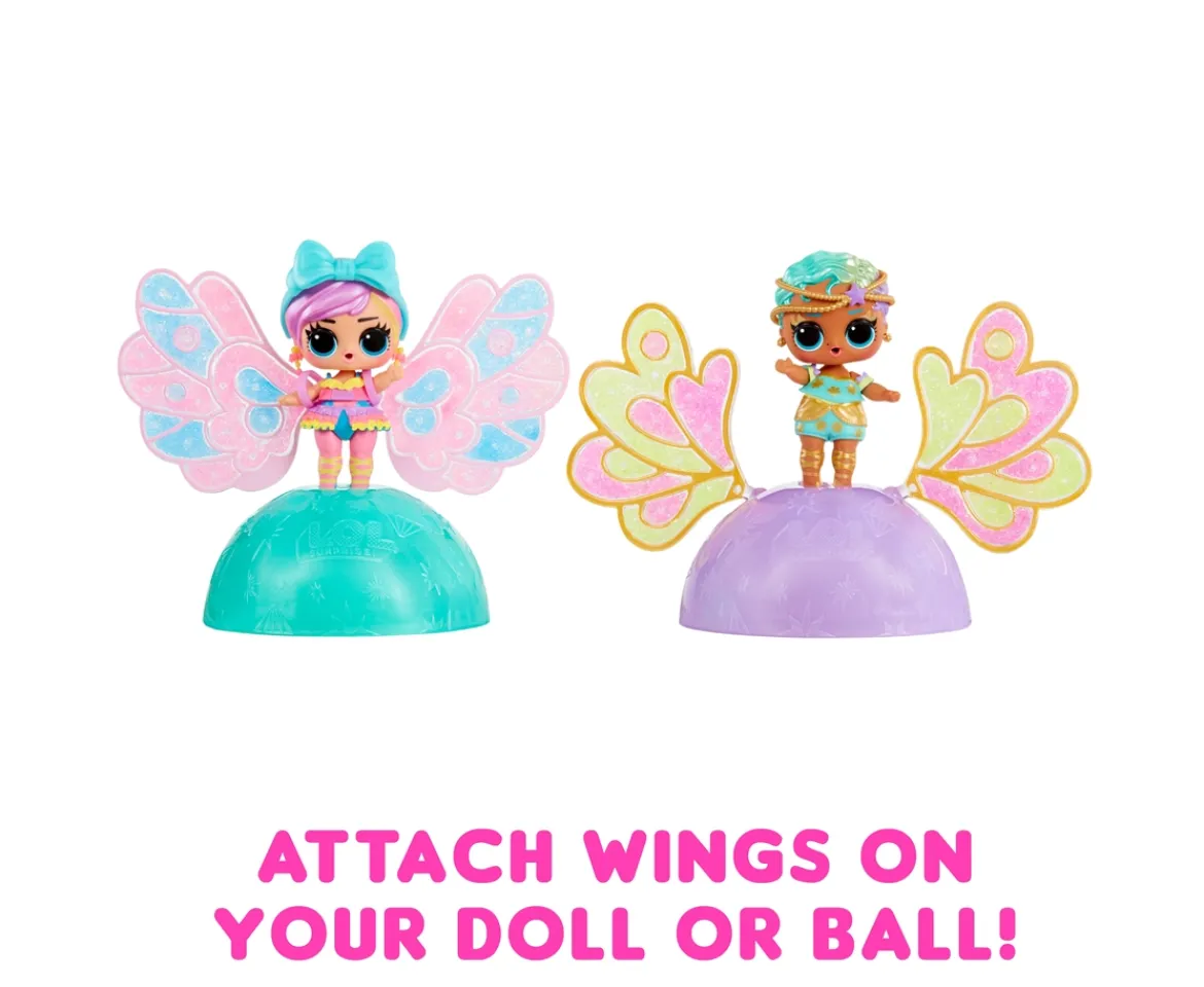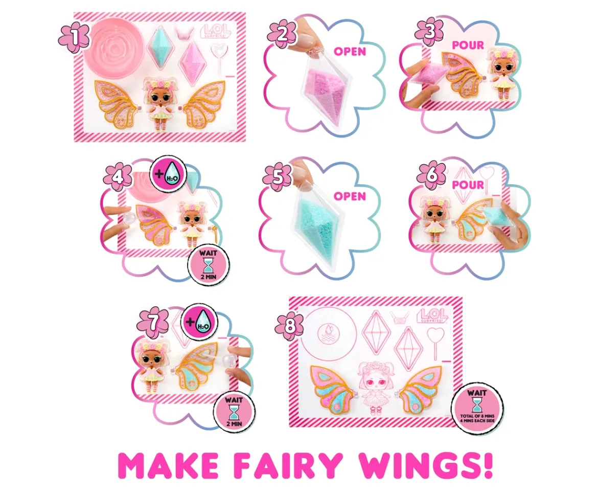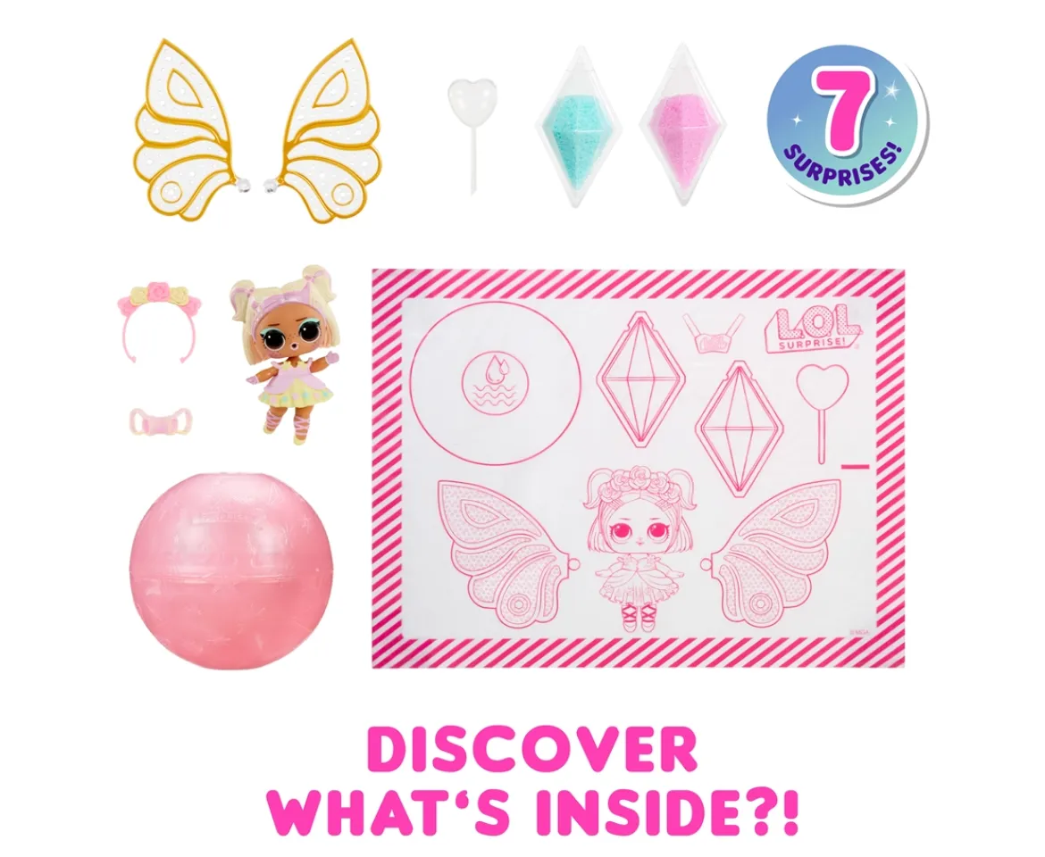 Explore the magic of fairies like never before with the all-new L.O.L. Surprise Fairies!™ Tots, including customizable fairy crystal wings and fashionable accessories! This hands-on, creative experience is the perfect magical collectible for kids, providing a simple introduction to imaginative crafts. Discover the enchanted magic of your Fairy Tot by opening the ball to reveal your surprise doll, fairy wings, fairy crystal kit, and accessories! To customize your fairy wings, lay the wings flat on the included playmat and spread two colors of fairy crystal mix into the open sections of the wings to create your desired pattern. Ready for the magic to happen? Use the adorable heart pipette to drop water over the fairy dust to set your beautiful design. When you’re done, wait two minutes for the crystals to dry before moving on to the other side. When both wings are fully set, your fairy is ready for you to clip on her sparkling new wings! Don’t forget to unwrap the other cute surprises to accessorize your tot with her adorable dress and matching headpiece! Each Tots doll has sweet features, a unique hairstyle, and her own precious outfit. When playtime is over, the ball doubles as a display stand to show off your Fairy Tot and her beautiful wings! Discover what’s inside and collect all 8 L.O.L. Surprise Fairies Tots™ collectible dolls with customizable wings. Note: Adult supervision is advised.L.O.L. Surprise collectible dolls with stylish hair, outfits and many detailed accessory pieces make a perfect toy for kids, including 4 years old and up for imaginative pretend play! As gifts for any special occasion, dolls provide hours of social play with siblings and friends! From MGA Entertainment, creators of L.O.L. Surprise fashion and collectible dolls, Rainbow High™ fashion dolls, Na Na Na Surprise dolls, Bratz® fashion dolls, MGA’s Dream Ella™, MGA’s Glitter Babyz™, Lalaloopsy™, Baby Born® Surprise baby dolls and collectibles, Little Tikes® kids toys and many other favorite brands.