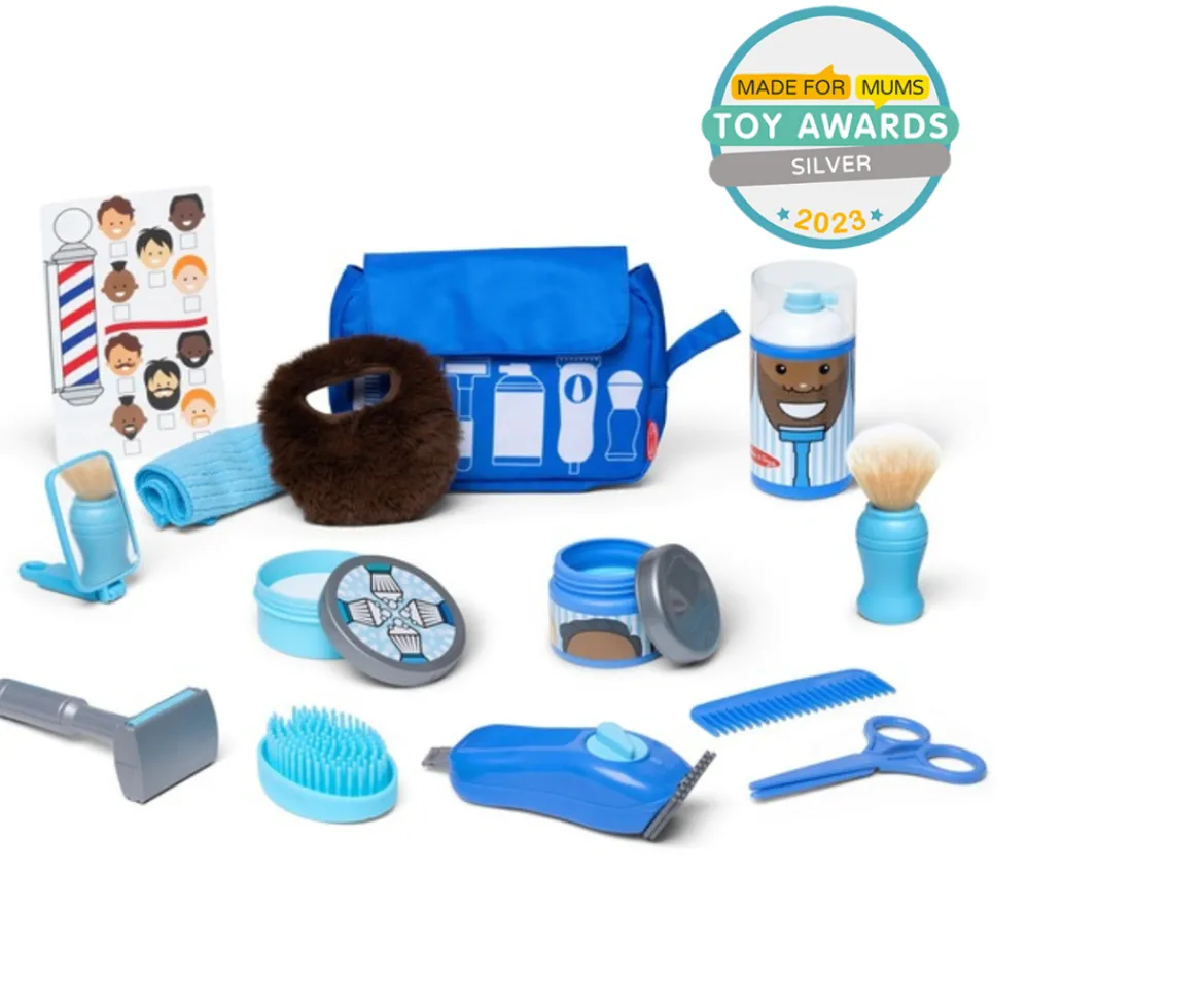 Cut, trim, shave, and style with pretend play shaving essentials for a trip to the barber! Style and pretend to trim a soft, wearable beard with adjustable straps. For a traditional shave, swirl squishy, textured shaving cream in a tub with a soft-bristled brush to pretend to lather up, then trim with play scissors. For a more modern shave, there’s a pump shaving cream can, trimmers that vibrate when the tab is pulled (no batteries required) and a rolling razor for a “smooth finish.” Kids can check their look in the hand mirror that flips to stand as they finish with textured pomade in a tub, comb, and brush. Includes a reusable double-sided activity card. Engaging, pretend-play fun allows both boys and girls three and older to play the barber or the customer! Everything stores in a sturdy zippered shaving kit for easy cleanup.