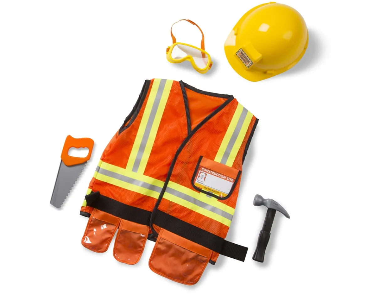 - Includes vest with tool belt, hard hat, goggles, hammer, saw and name tag for pencil personalisation.
