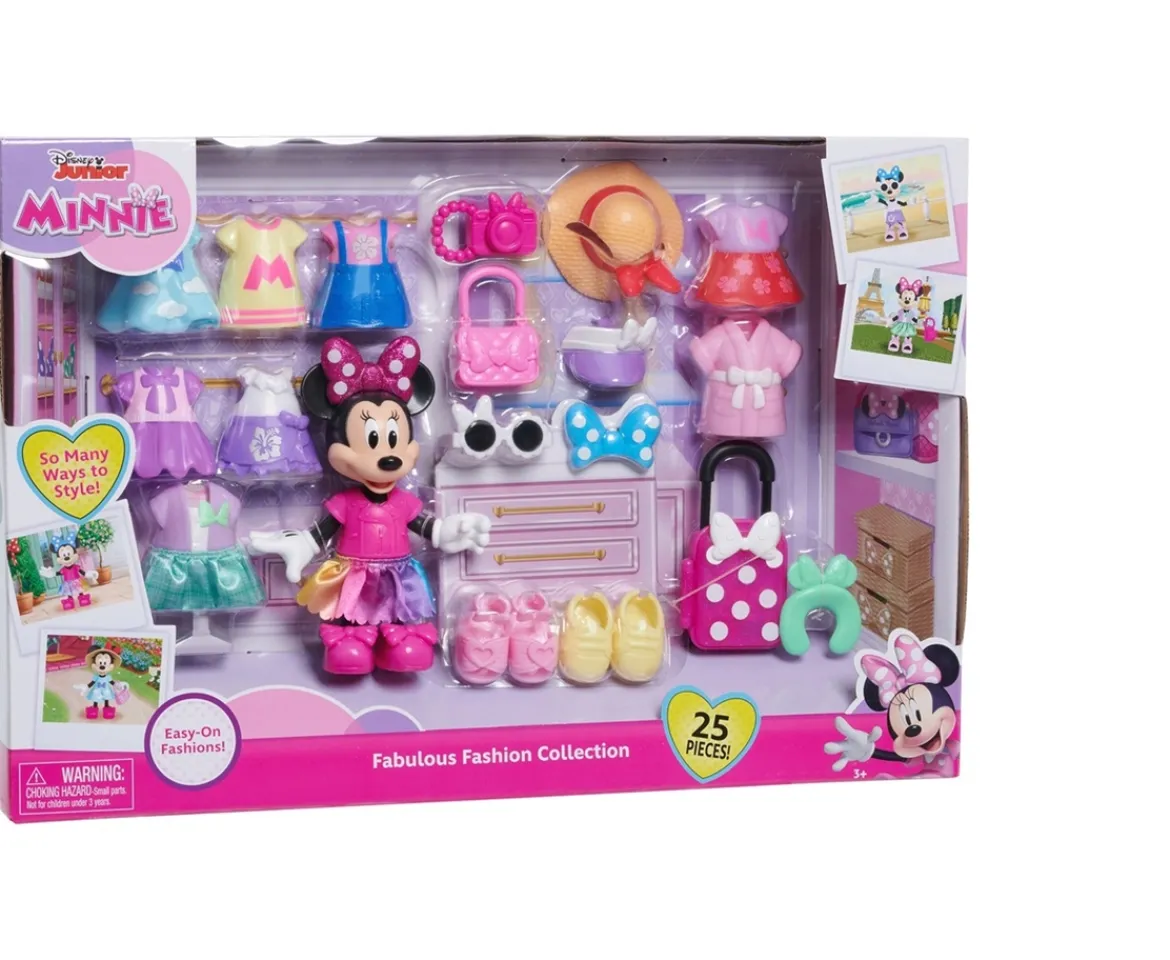 - Contents: 1x Minnie figure, 9x outfits, 2x bows, 2x hats, 3x pairs of shoes (6 total) , 1x pair of toy sunglasses, 1x handbag, 1x suitcase, 1x camera & 1x travel pillow