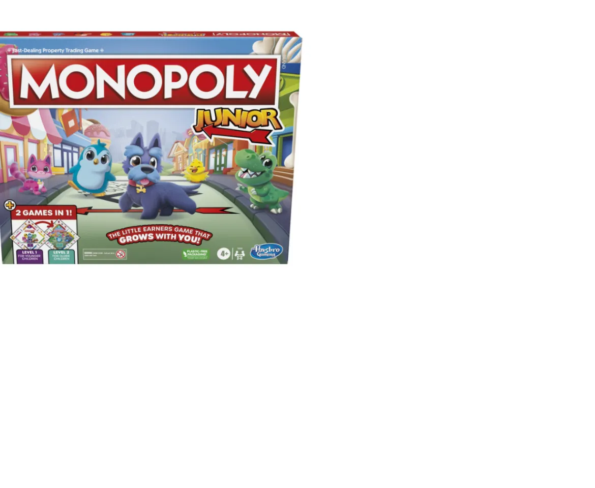 With 2 games in 1, this Monopoly Junior game is the little earners game that grows with your child! Its double-sided gameboard offers 2 levels of play, so families can decide which level is best for them. The Level 1 game, recommended for ages 4-5, helps kids practice matching and counting, as they count spaces, match pictures, and buy properties. The player with the most properties wins! Ready to move up a level? Flip over the board for the more advanced Level 2 game, recommended for ages 6 and up, that focuses on reading and simple math. Players can land on kid-friendly spaces, buy properties, collect rent, and discover their fortune! To win, be the player with the most money. Gameplay in each level uses its own set of Monopoly money and cards, as well as rules. Both games include 6 cute tokens: Penguin, Car, Ducky, Scottie, Hazel, and Little T-Rex. Bring out this fun preschool game for playdates or Family Game Night and make some memories.The Hasbro, Hasbro Gaming, and Monopoly names and logos, the distinctive design of the gameboard, the four corner squares, the Mr. Monopoly name and character, as well as each of the distinctive elements of the board and playing pieces are trademarks of Hasbro for its property trading game and game equipment.