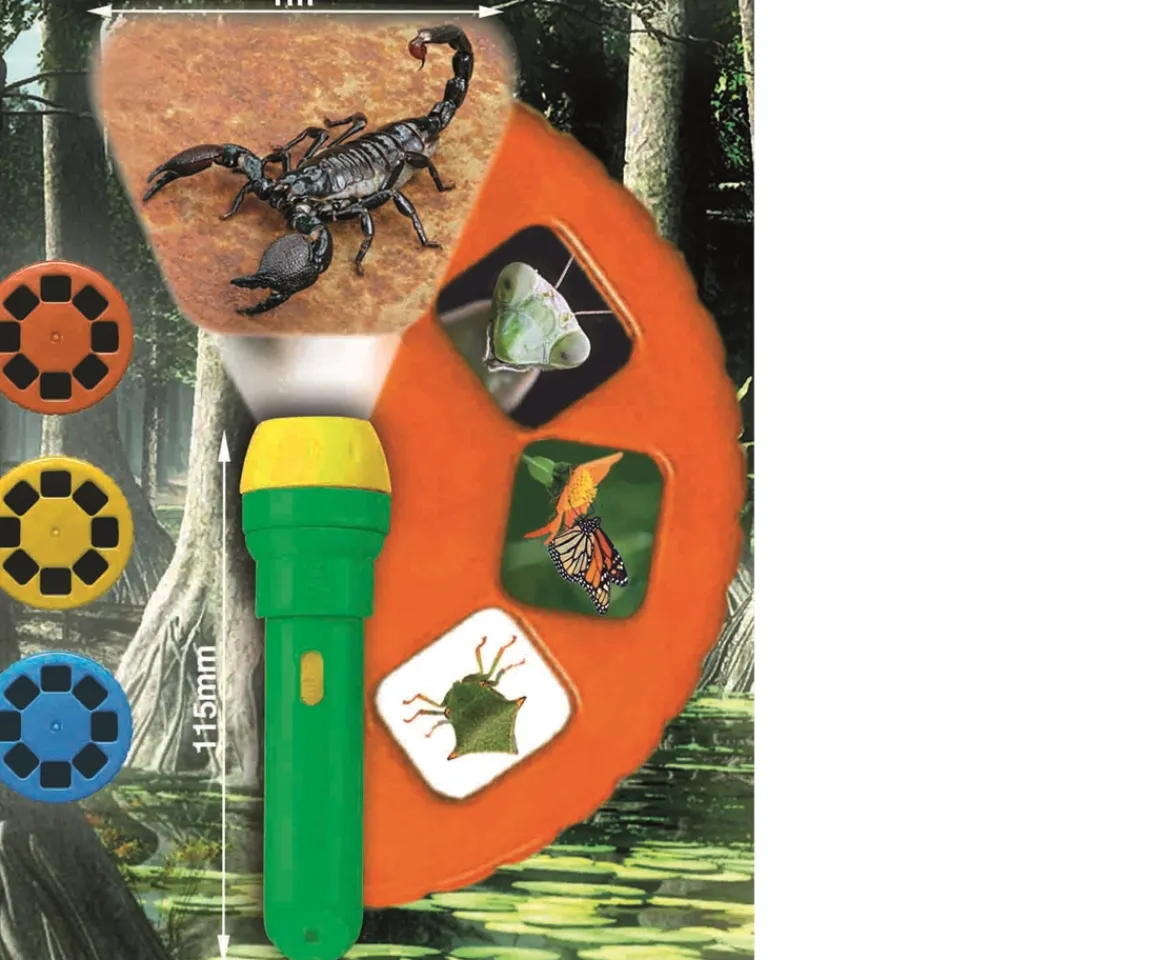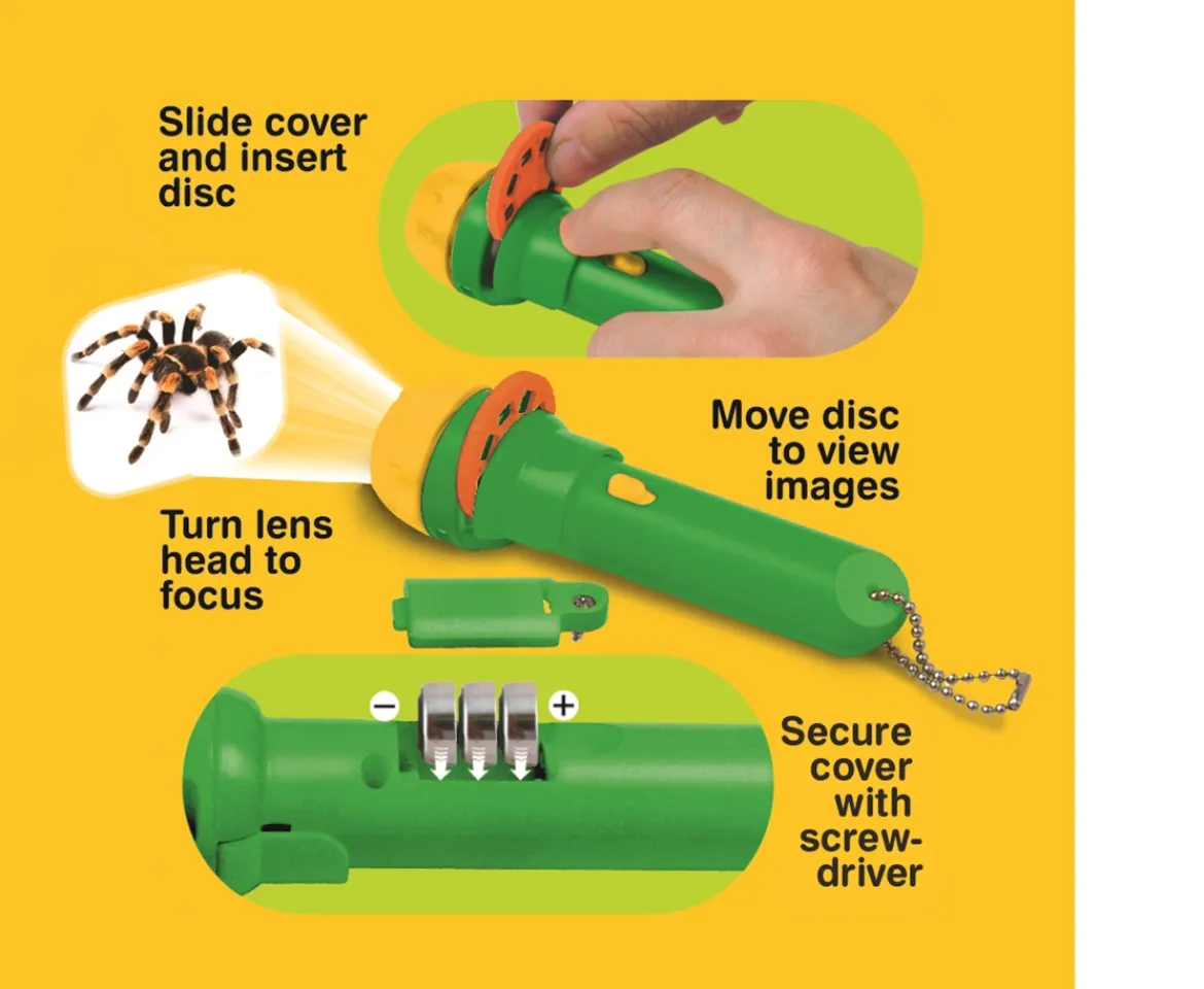 This handy LED torch is also a photo projector, projecting colourful images up to one metre wide onto walls and ceilings. Includes 24 scary images of beetles, cockroaches, spiders and many other different insects. Batteries included. The torch comes with three slide discs with 24 colour photographs. Swap and change the slides easily by pulling back the plastic flap and inserting the chosen disc then rotate the disc round to view the fantastic colour images which project up to one meter wide. Images are easily focused by turning the lens head. It can also be used as a normal torch without the slides in place and is great for keeping on bedside tables to give comfort to children during the night. Measuring 11cm long and approximately 3.5cm in diameter at the widest point. A perfect, fun yet educational, gift for boys and girls who are interested in dinosaurs. Kids grow out of toys earlier and earlier but torches still appeal to kids into their tween and teen years. Ideal for pyjama parties and sleepovers.