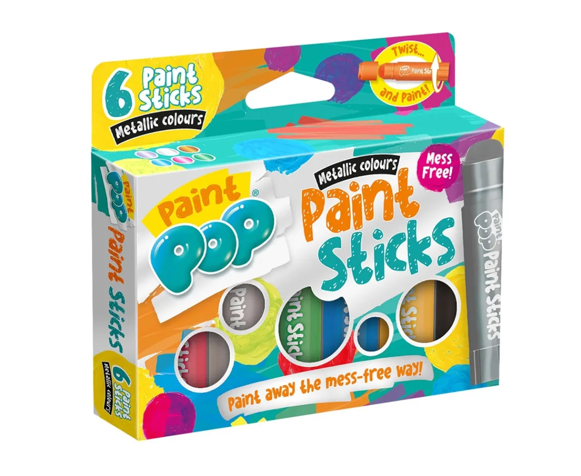 Paint Pop Paint Sticks are the perfect introduction to painting and doodling.They’re bright and colourful, with no mess, creating a happy experience for all!The chunky shape is easy for little hands to hold and the smooth, glide-on paintworks without needing water or brushes.Twist the stick and you’re ready to paint, whether at home or on your travels.Be creative on a wide range of surfaces including on paper, card, canvas,wood and even glass.Wipe clean from glass andwhiteboards using a damp cloth.