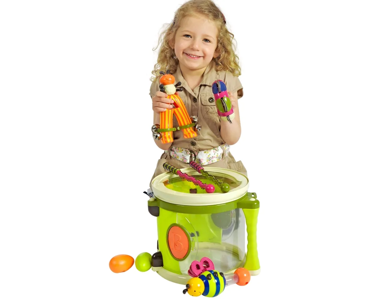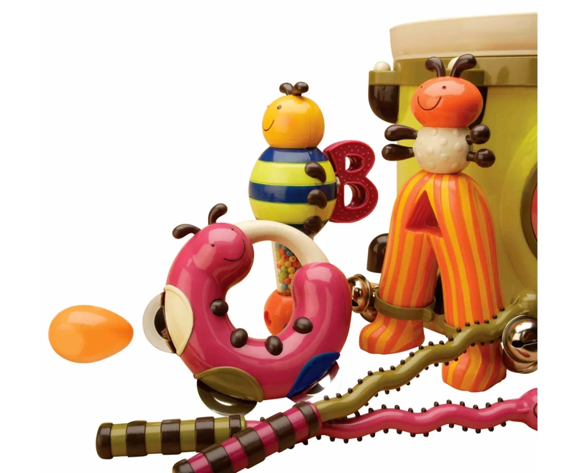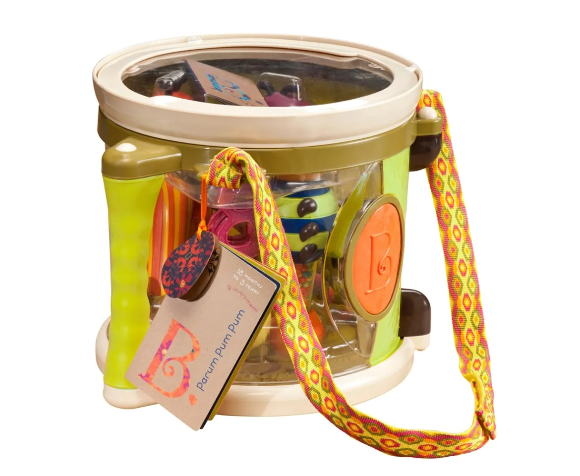 March to the beat of your own drum with the B. Parum Pum Pum Musical set. Included is the silly centipede drumsticks, jingle bells ant, busy bee maraca and clacker, cute caterpillar tamborine, one shake-shake egg and storage drum. Perfect for a child ages 18 months – 3 years. The set is also BPA-free, lead-free and phthalate-free.