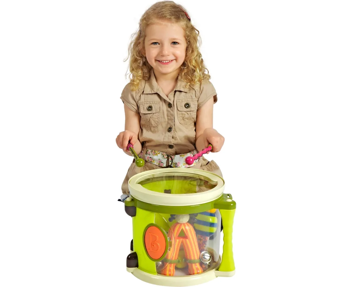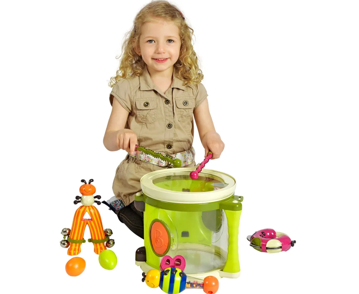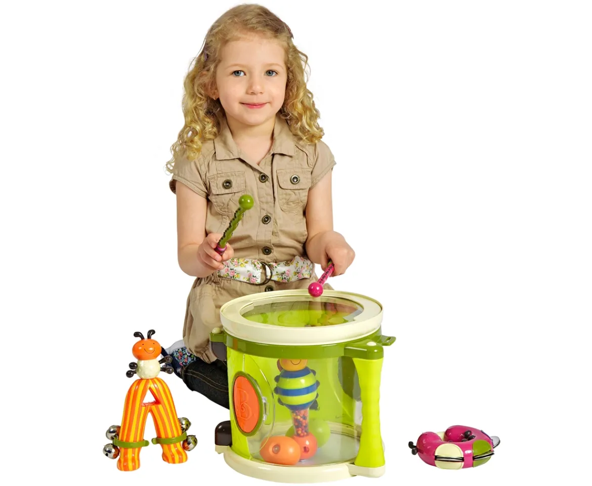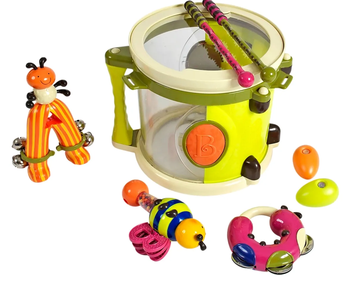 March to the beat of your own drum with the B. Parum Pum Pum Musical set. Included is the silly centipede drumsticks, jingle bells ant, busy bee maraca and clacker, cute caterpillar tamborine, one shake-shake egg and storage drum. Perfect for a child ages 18 months – 3 years. The set is also BPA-free, lead-free and phthalate-free.