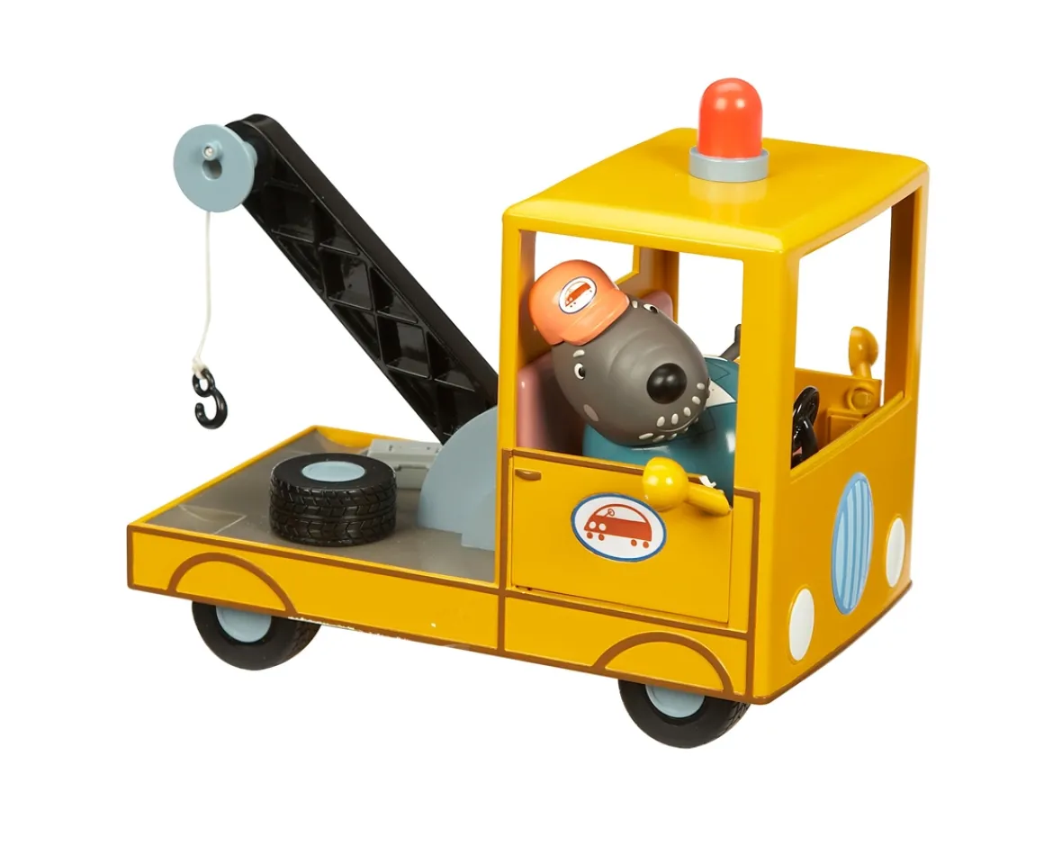 Save the Pig Family with the Grandad Dogs recovery set. Daddy Pig hit a pothole and got a flat tyre or they’ve run out of petrol. Grandad Dog has a tow truck and comes to their rescue.