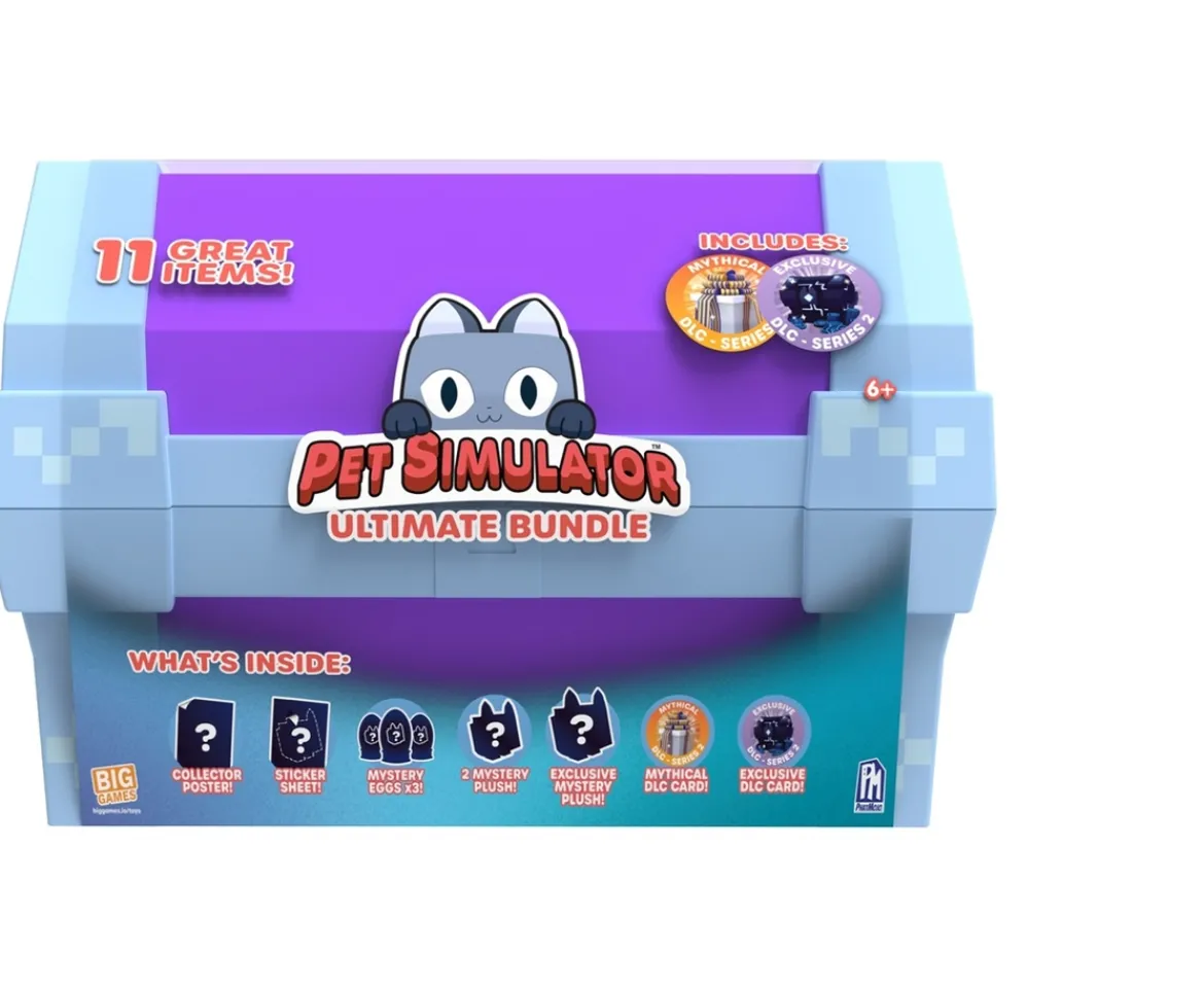 From the hit game, Pet Simulator, comes the Ultimate Bundle Pixel Chest! Open the reusable, 30.5cm long storage container to reveal 11 great items.Your new treasure includes 3 Mystery Eggs with Pixel Pets, 2 Mystery Plush, an Exclusive Mystery Plush, a Holographic Sticker, a Collector Sheet and more. Inside you will also find a Legendary and an Exclusive DLC Code!