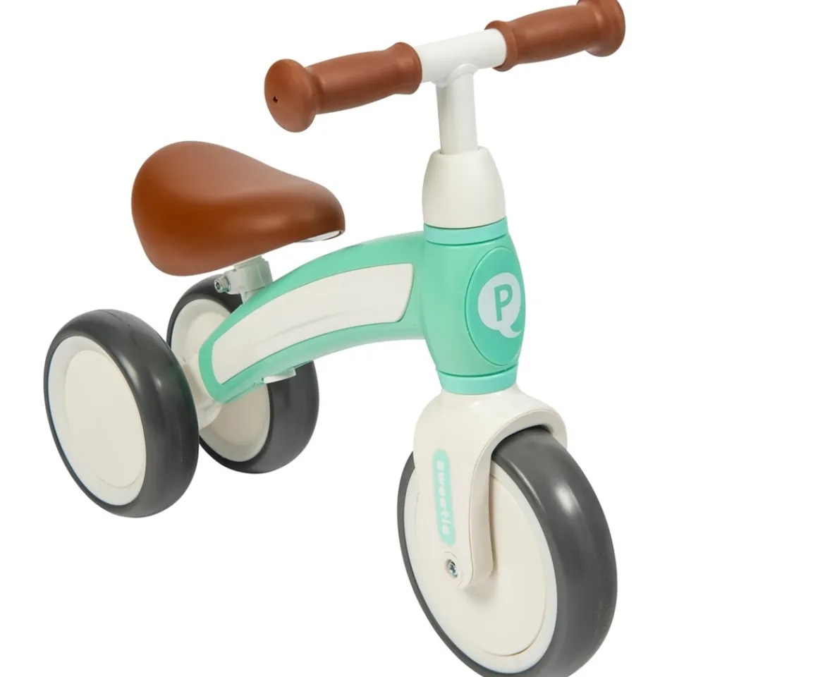 With a retro-inspired design, the Q Play Sweetie Walker Bike in Mint is a sleek 3-wheel trike, with a light frame and stable design to help little ones develop their balance during playtime! The easy-grip handles and padded seat have a vintage brown look for eye-catching style, so kids can build confidence, and create lasting playtime memories.This unique 3-wheel balance bike for kids stands out, with a 2-height handlebar and adjustable saddle to grow with kids, and a compact frame sized for travel and storage. Three large wheels help little ones develop coordination, with a mint frame for a fresh finish.