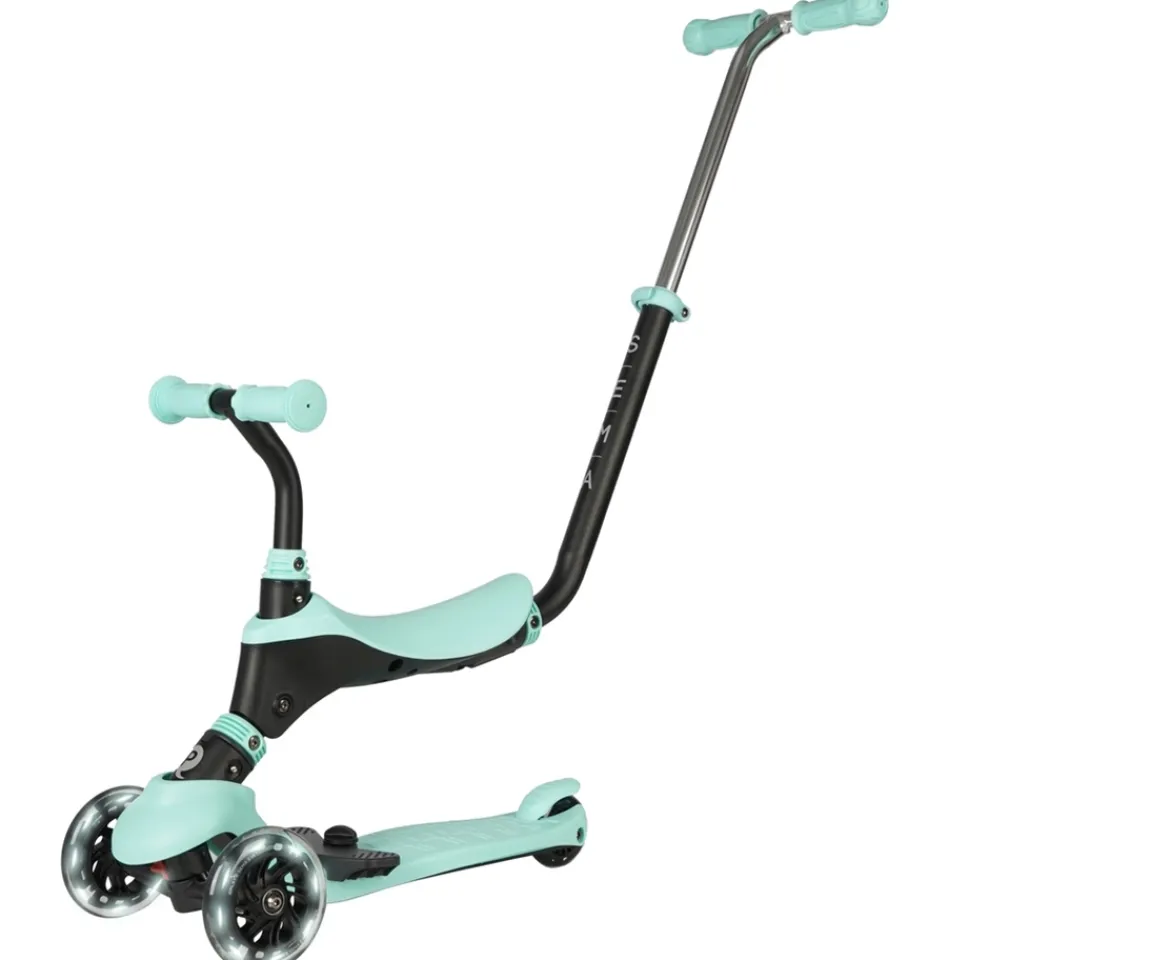 The QPlay SEMA 5-in-1 LED Scooter in Mint is a fantastic and foldable system with five modes that grow with little ones! It easily transforms from a pushchair to push-handle scooter, balance scooter, ride-on and self-standing scooter, making the QPlay SEMA 5-in-1 suitable from 12 months, and older children up to six years old.With a stable design, featuring three lightweight wheels, and a height-adjustable push bar for parents means little ones travel comfortably in pushchair mode with a removable footrest and adjustable seat. In scooter mode, the QPlay 5-in-1 features a low deck, height adjustable soft-grip handlebars and flashing LED front wheels, making it a stylish addition to outdoor adventures that grows with kids.The QPlay SEMA is built to perform, and designed to look good, with a steering limiter and safety brake, streamlined finish and anti-marking wheels for indoor or outdoor use. In a modern mint colour, this QPlay scooter guarantees fun and comfort for parents and little ones!