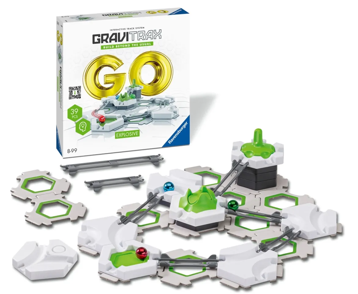 - GO Explosive contains everything you need to get to know GraviTrax! Curves, tracks and height stones create with the small hexagonal base plates the basis for individual tracks with the Action-Element Volcano. How far do the balls make it after the "volcanic explosion"?