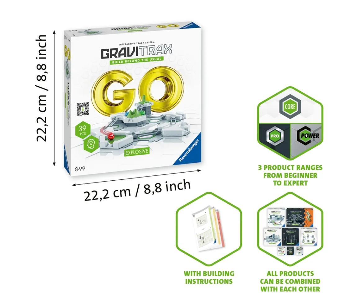 - GO Explosive contains everything you need to get to know GraviTrax! Curves, tracks and height stones create with the small hexagonal base plates the basis for individual tracks with the Action-Element Volcano. How far do the balls make it after the "volcanic explosion"? The set includes 3 building instructions in the difficulty levels "easy", "medium" and "challenging". Furthermore, there are 4 exciting and varied tasks to solve. This provides a playful and creative introduction to the GraviTrax universe.