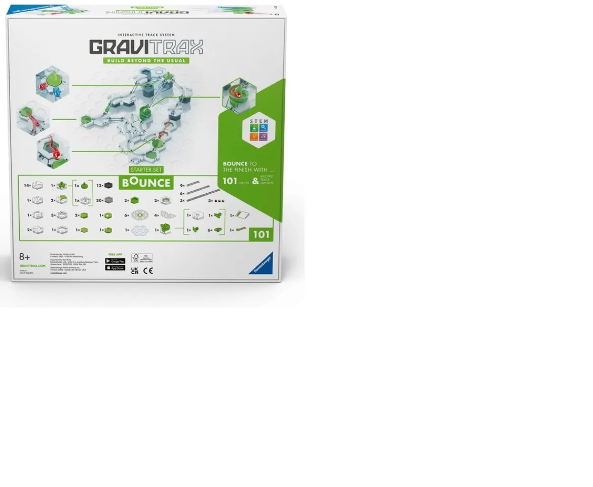 Unlock the infinite possibilities of the GraviTrax Universe with the Ravensburger GraviTrax Starter-Set Bounce. With this unique and interactive track-building system, create and experience marble run action like never before. The GraviTrax starter-set bounce includes 101 pieces and features two action Elements to add wow-factor to your tracks.Send your marble round and round the bend with the spiral element and bounce your way to the finish with 2-part trampoline element. Take inspiration from the included track layout plans or simply let your imagination go wild. Add in twists, turns and trick shots to send your marble racing around your tracks.Build beyond the usual with GraviTrax as you challenge yourself, experiment and take the action further than ever. This set is compatible with all other GraviTrax sets and accessories, so you can grow and expand your GraviTrax world however you choose.