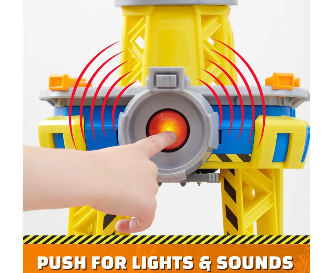 - 60-CM PLAYSET WITH LIGHTS AND SOUNDS: The Crane Tower features lights and sounds and building toys for kids, like a working crane toy with a claw attachment, a compound moulding area, a lift and more