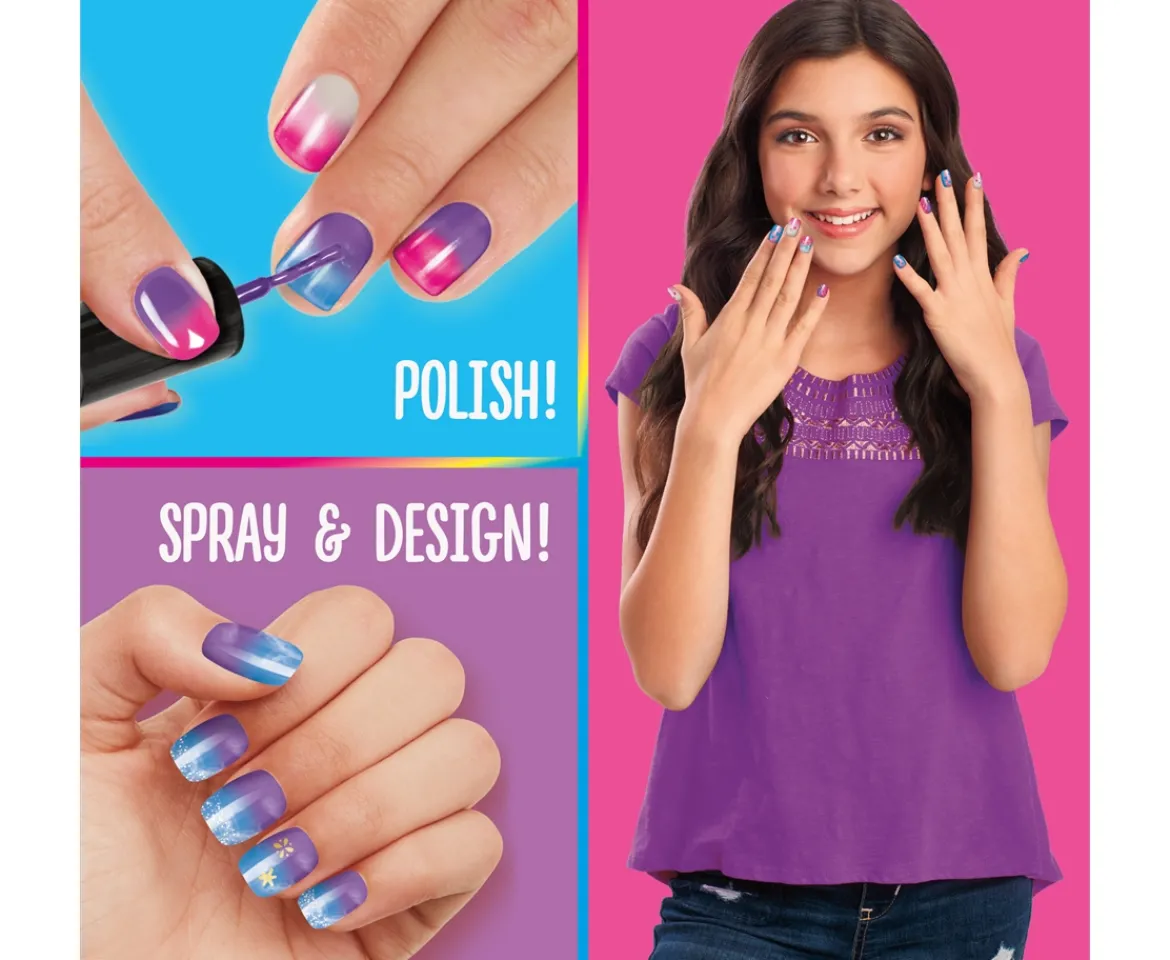 Create amazing airbrush nail art with the Shimmer ‘N Sparkle Airbrush Nail Design Studio! It’s like having a nail salon in the comfort of your own home. Create a crazy amount of cool designs with totally trendy shimmering and glitter effects! Have a super fun nail party with you as the nail stylist!POLISHFirst, polish your nail with one of the on-trend colours included to create a beautiful base. Polish your own nails or use one of the press on nails included in the setSPRAYNext, it’s time to create amazing airbrush effects! Simply place your freshly polished nail into the airbrush booth then press the pump to spray your colour. Move your nail around as needed to get the effect you desire. Watch in amazement as it creates a stunning glitter or shimmer effectThe studio includes an array of shimmering accessories to help you create dazzling designs for your nails. Sprinkle glitter and place sequins for that extra sparkle, or add nail stickers and gems for that totally on trend finish.