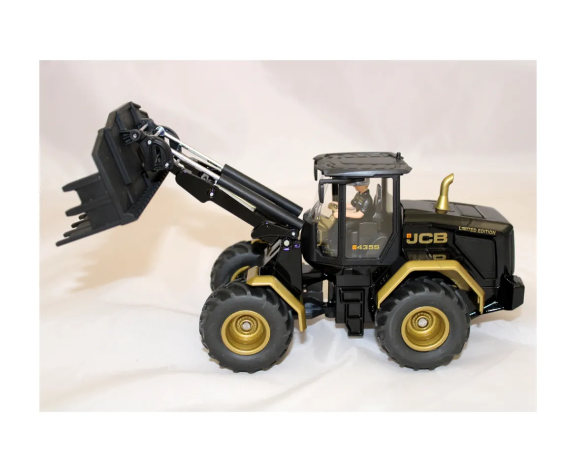 JCB 425S agri wheel loader with decal detail, enclosed cab, articulated steering, adjustable loader arm and removable shovel, rolling wheels with tyre tread detail and towbar hitch. In black and gold limited colours.