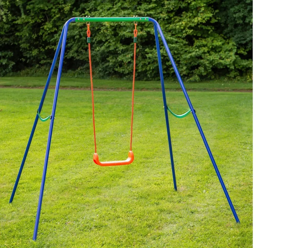 The bright and colourful Single Swing is an excellent addition to any child’s back garden! Kids will love having all the fun of a playground just outside their door.The metal frame of the Single Swing is sturdy and durable, built to last out in the elements. The Single Swing is sure to be a playtime hit—not much can beat the thrill of feeling like you’re flying! The plastic swing seat is moulded to offer kids greater comfort and a secure fit as they play.The bright blue and green frame of the Single Swing, along with the cheerful orange swing seat, is sure to add a splash of colour to your garden. This outdoor favourite is sure to get your kids out to play.The compact frame makes the Single Swing perfect for a garden of any size. Unassembled, the Single Swing fits easily into most cars, so you can take home the playground today. This swing set has a maximum user weight of 50kg, so it’s sure to give your kids hours of outdoor fun for many years to come