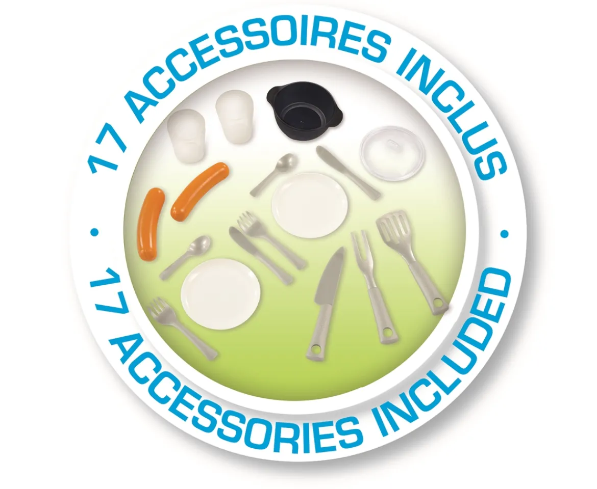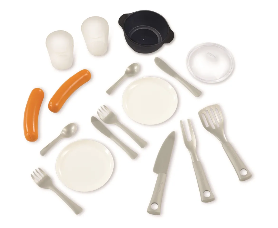 - Contents: 1x playhouse, 1x picnic area, 2x flower pots, 2x glasses, 2x plates, 6x cutlery pieces, 3x cooking utensils, 1x cooking pot & 2x pretend sausage accessories