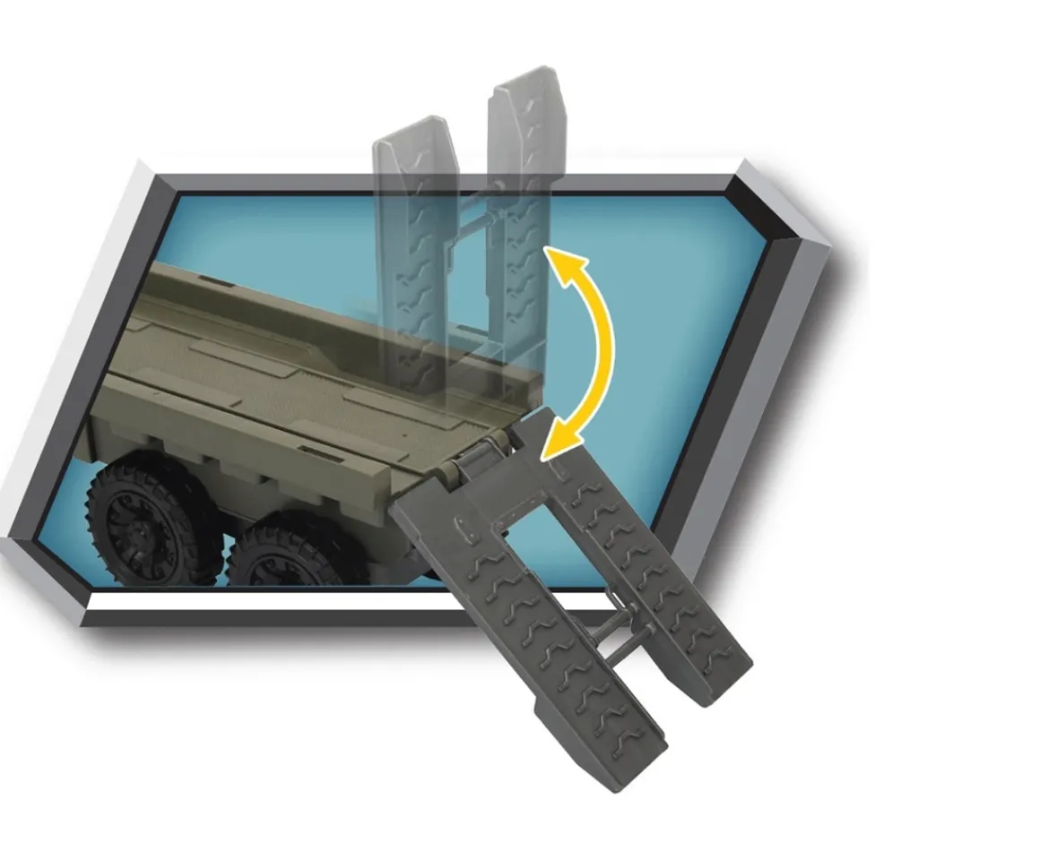 - Features flatbed and ramp to roll vehicles off to battlefield