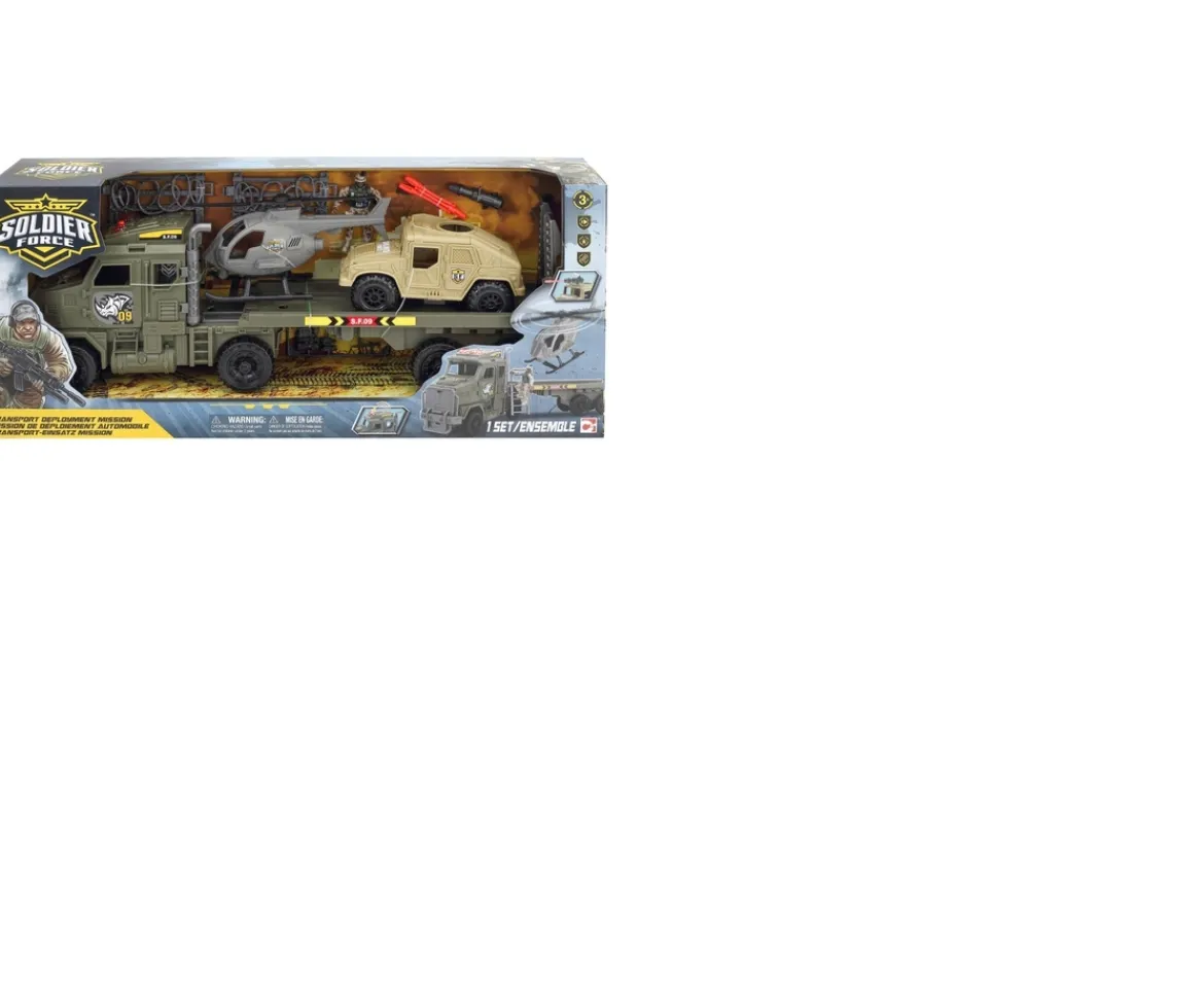 No matter how big or dangerous the mission, your troops will prevail! The HET (heavy equipment transport truck) carries everything needed for any situation on the battlefield. If the enemy is advancing below, command the helicopter and stop them from above! Spin the propellers as you pretend to fly. There’s also a free-wheeling battle rig that can handle any terrain, perfect for tactical missions.Load, aim and fire the missiles to knock down enemy forts, barricades and bunkers! The free-wheeling HET is has three different lights and battle sounds when you press the button! The other vehicles fit on the HETs flatbed. Flip down the ramp to roll the vehicles onto the truck. Attachable weapons and accessories deliver additional firepower. Includes one Soldier Force action figure.