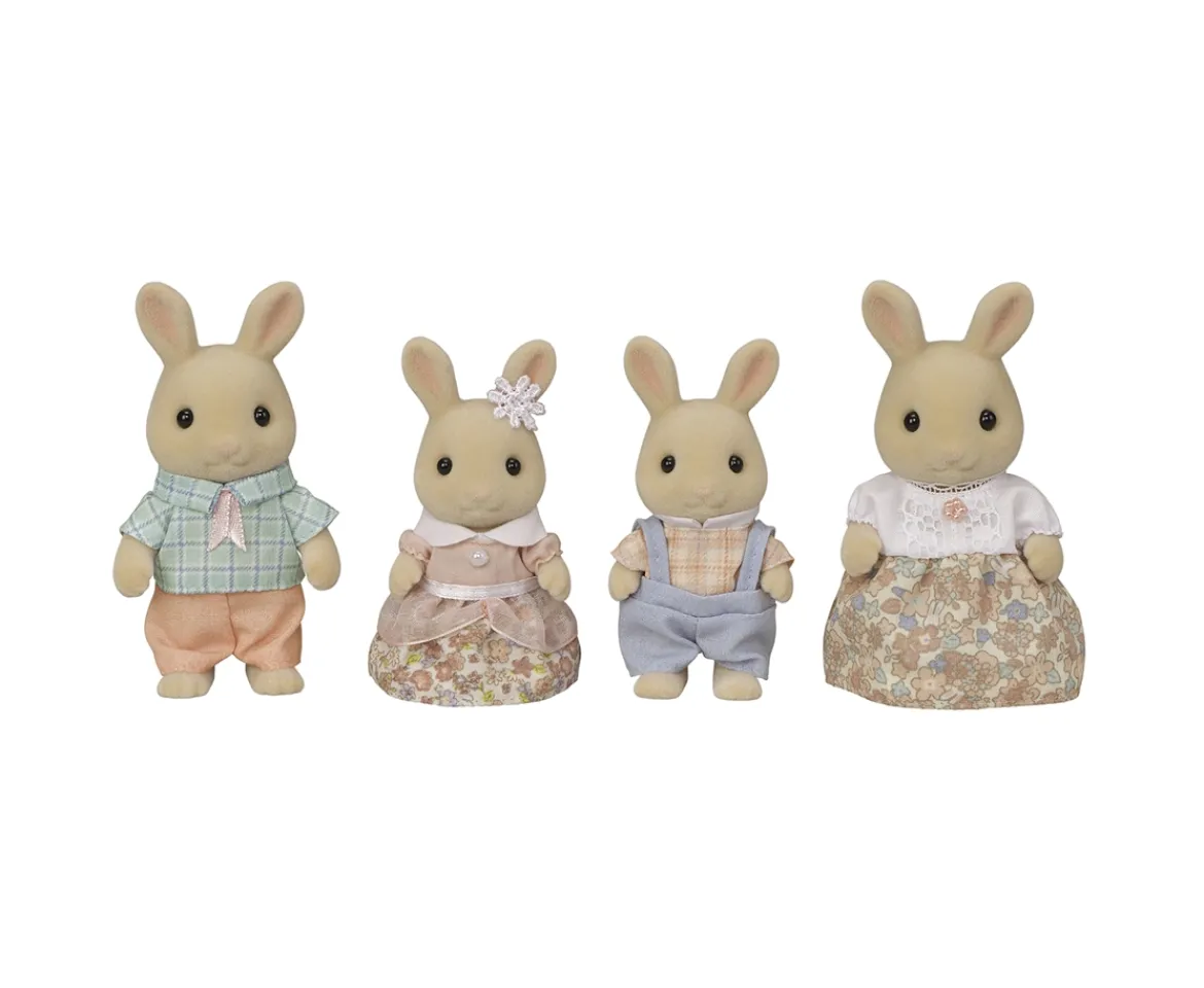 Set featuring the Milk Rabbit family in lively pink and blue outfits. Includes Milk Rabbit father, mother, boy and girl.